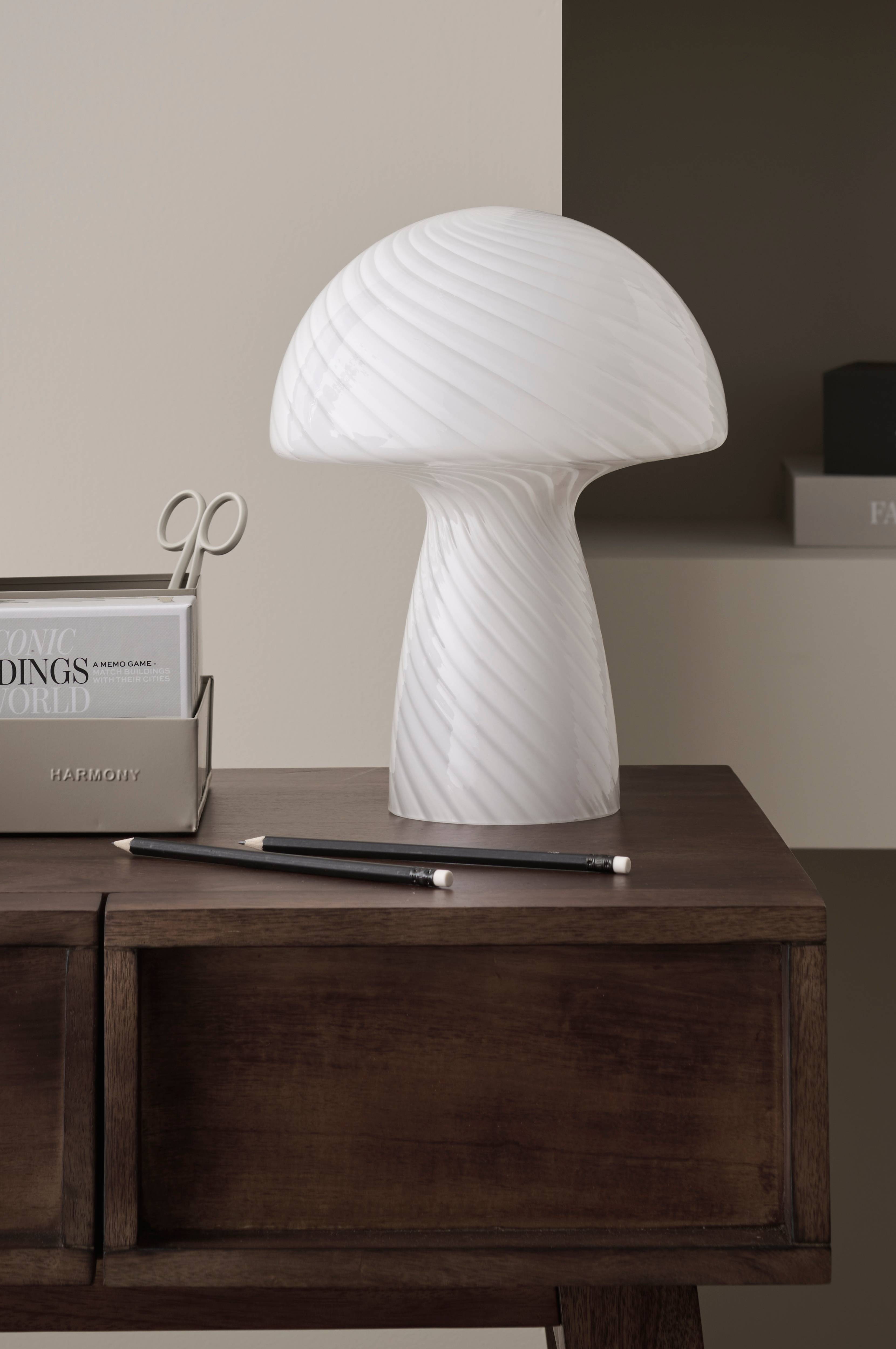 Bordlampe av hvitstripete, blankt glass med hvitlakkert indre sokkel og ekstern synlig detalj i plettert messing. Diameter 22 cm, høyde 30 cm. Transparent ledning med strømbryter.Lyspære er ikke inkludert.