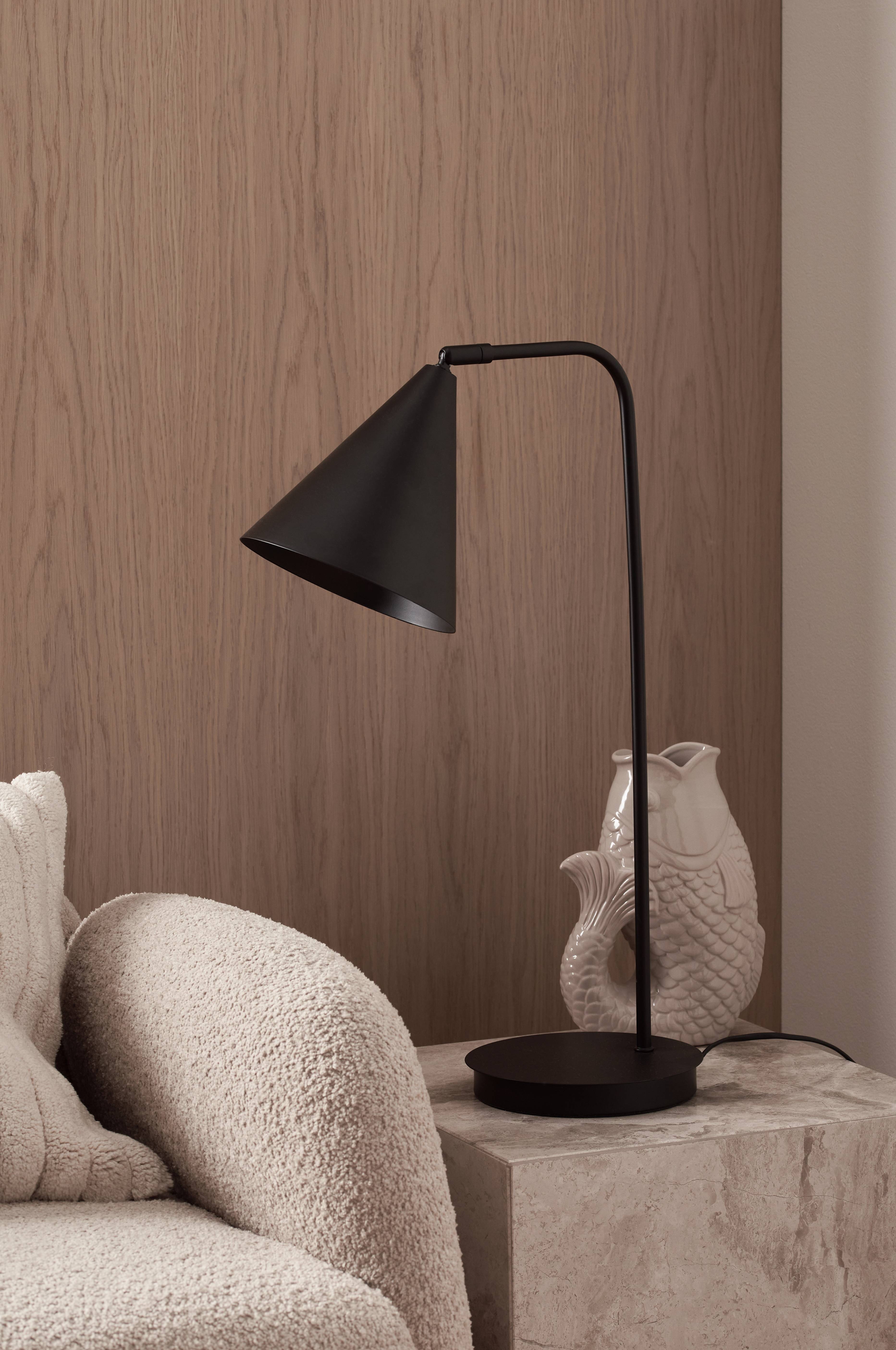 Bordlampe av metall med trendy, kjegleformet skjerm. Skjermen er justerbar i høyde- og sideledd. Ledning med strømbryter.Skjermens mål: Diameter 18 cm x høyde 20 cm.Lampefotens diameter: 18 cm.Lyspære er ikke inkludert.