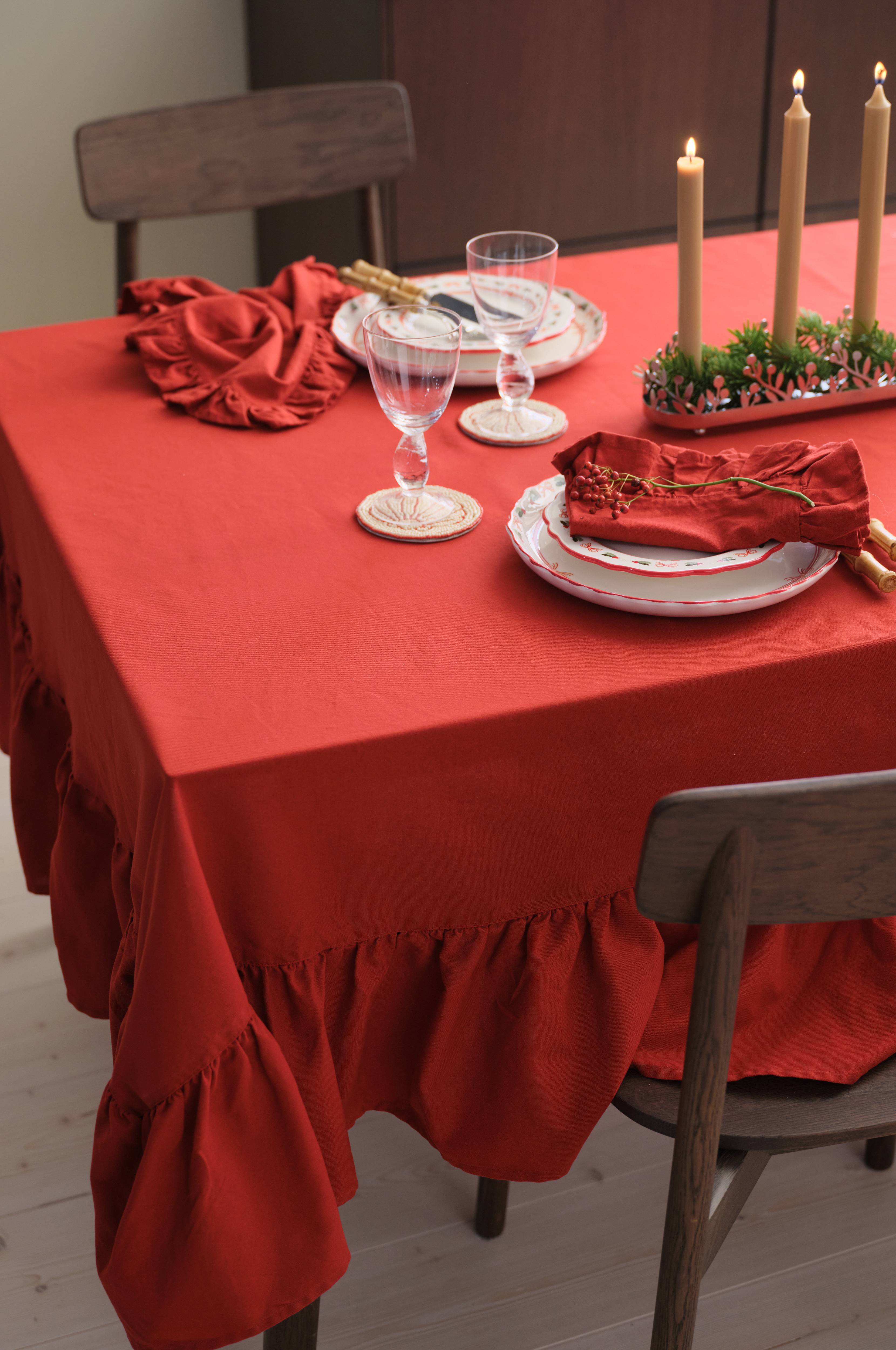 • Ensfarget duk i bomull• 20 cm volang hele veien rundt