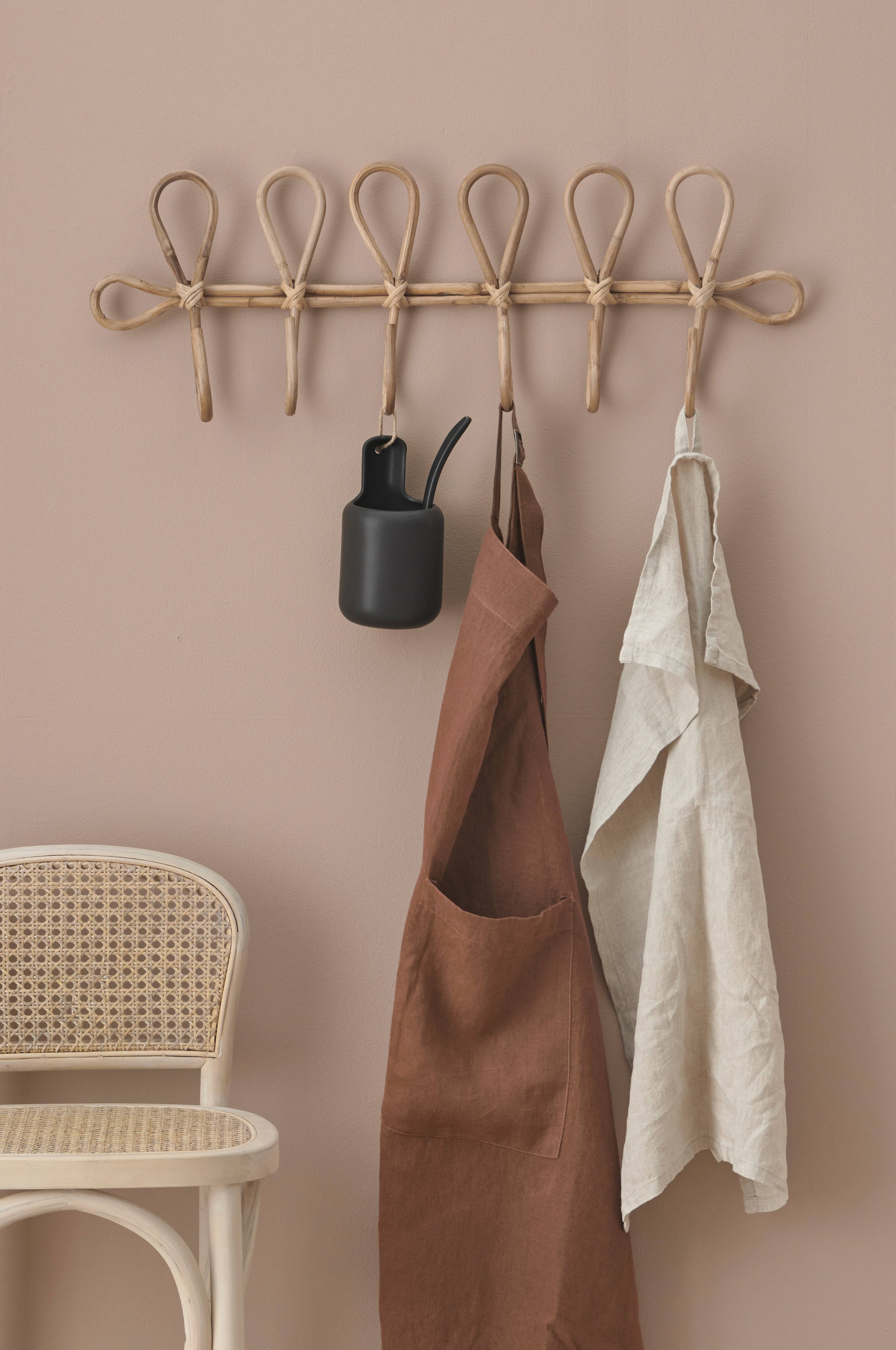 Knaggrekke av rotting med 6 knagger. Bredde 71 cm, høyde 24,75 cm, dybde 8,25 cm. Henges opp med skruer eller veggkroker (medfølger ikke). Produktet er håndlaget. Det innebærer at det kan forekomme visse forskjeller i målene.