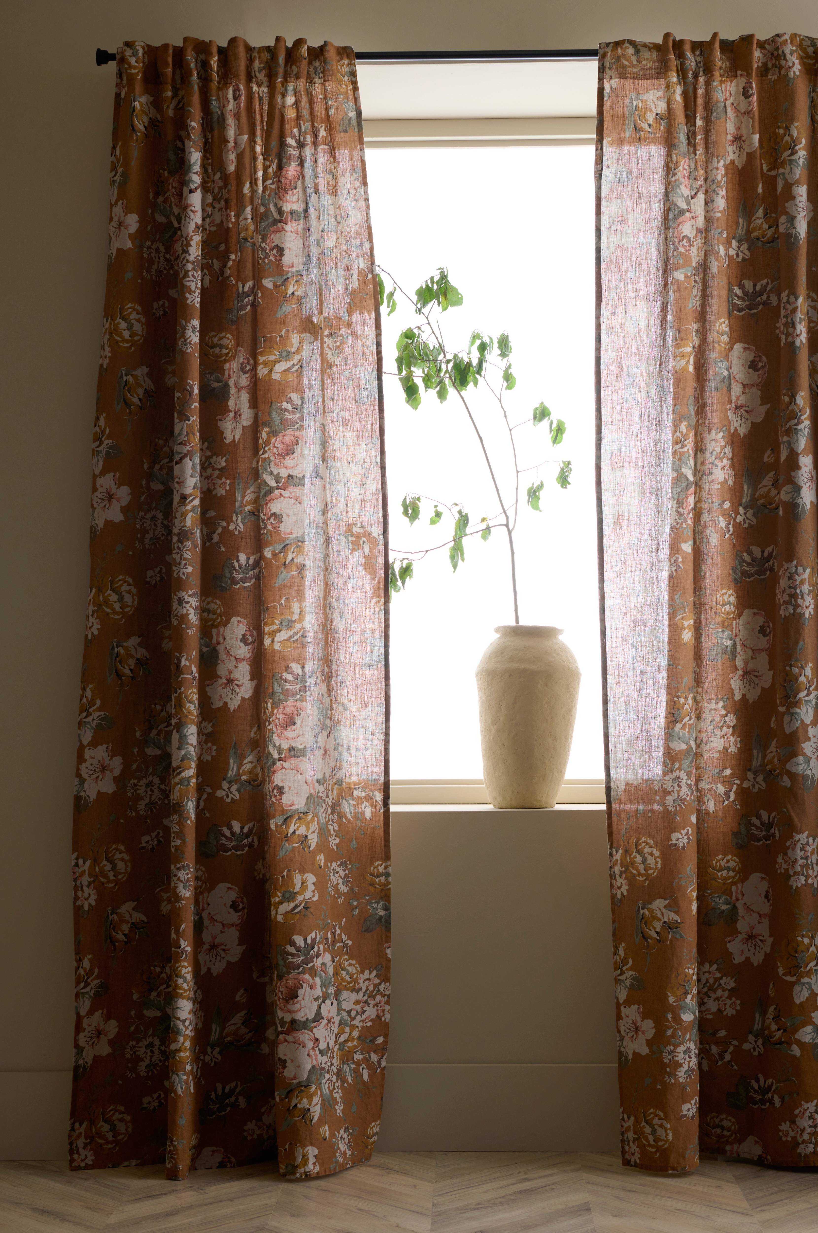 To gardiner med multibånd i vasket fransk lin med trykt mønster. Bredde 140 cm.