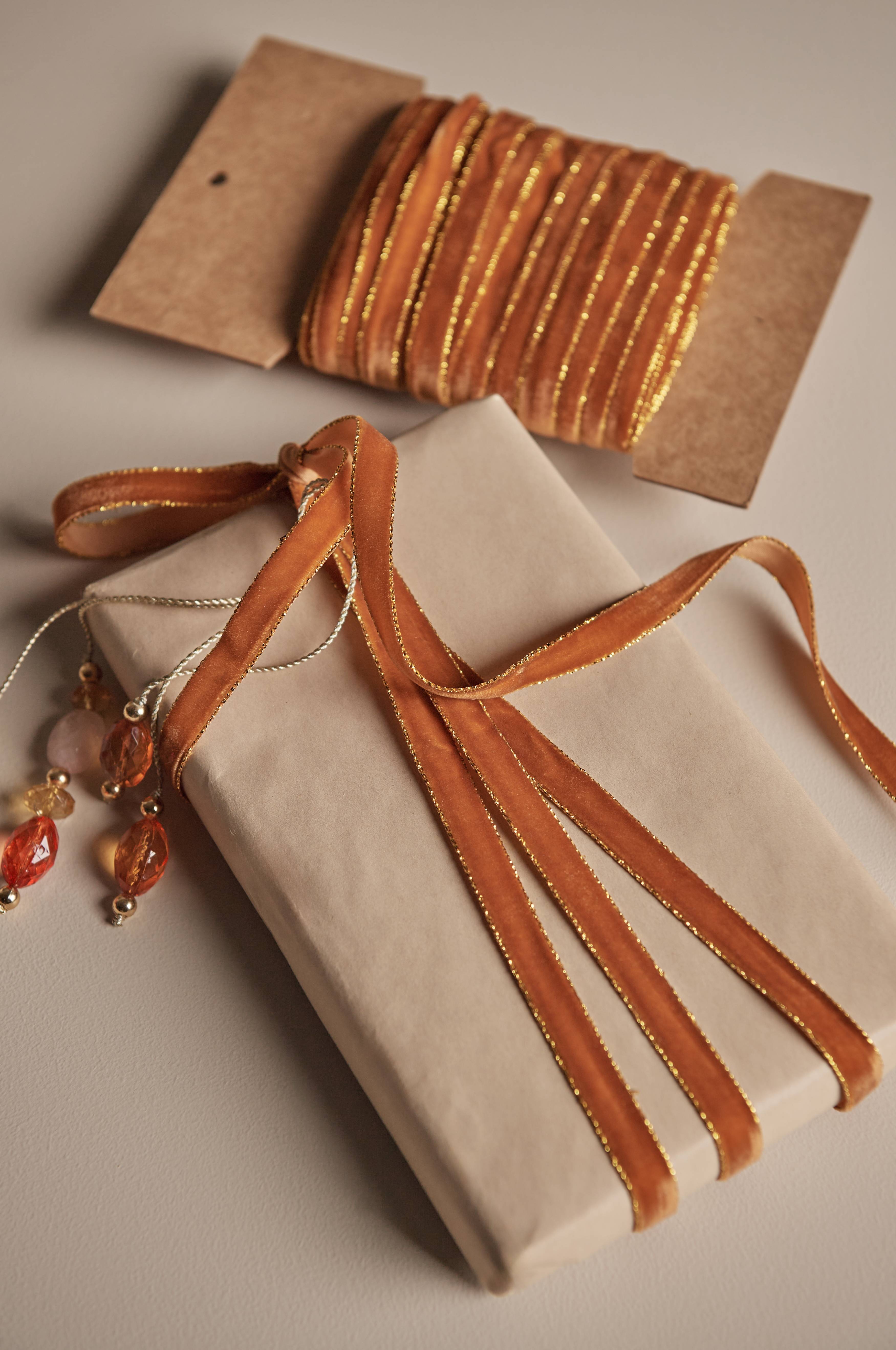 Bånd i fløyel av 100% nylon med gullglitrende kanter. Bredde 9 mm, lengde 20 m.