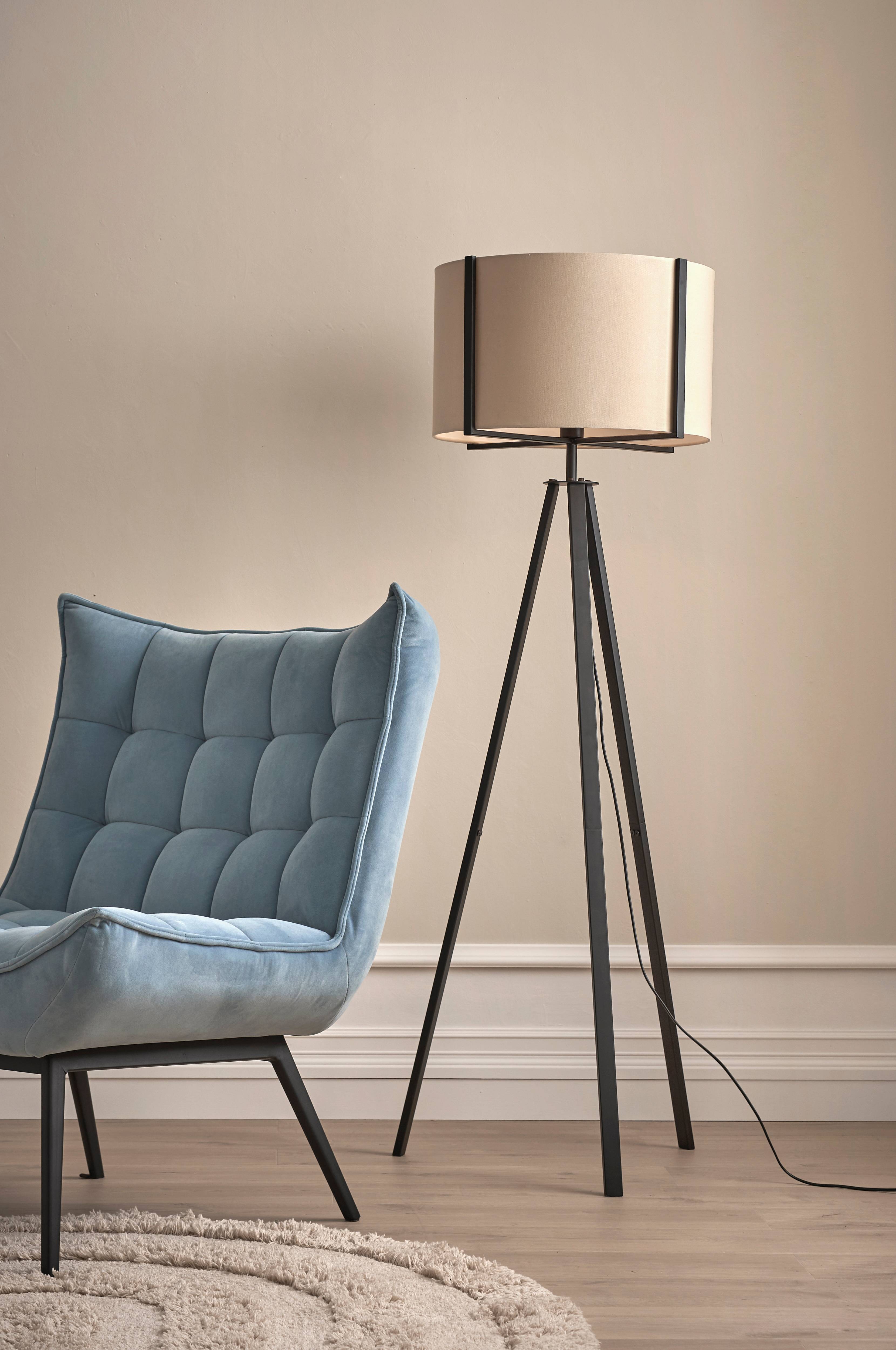 Gulvlampe med fot og skjermholder av metall med matt finish. Tekstilskjerm med grov tekstur. Skjermens mål: Diameter 50 cm, høyde 30 cm. Ledning med gulvstrømbryter. E27 sokkel, maks 60W. Lyspære er ikke inkludert.