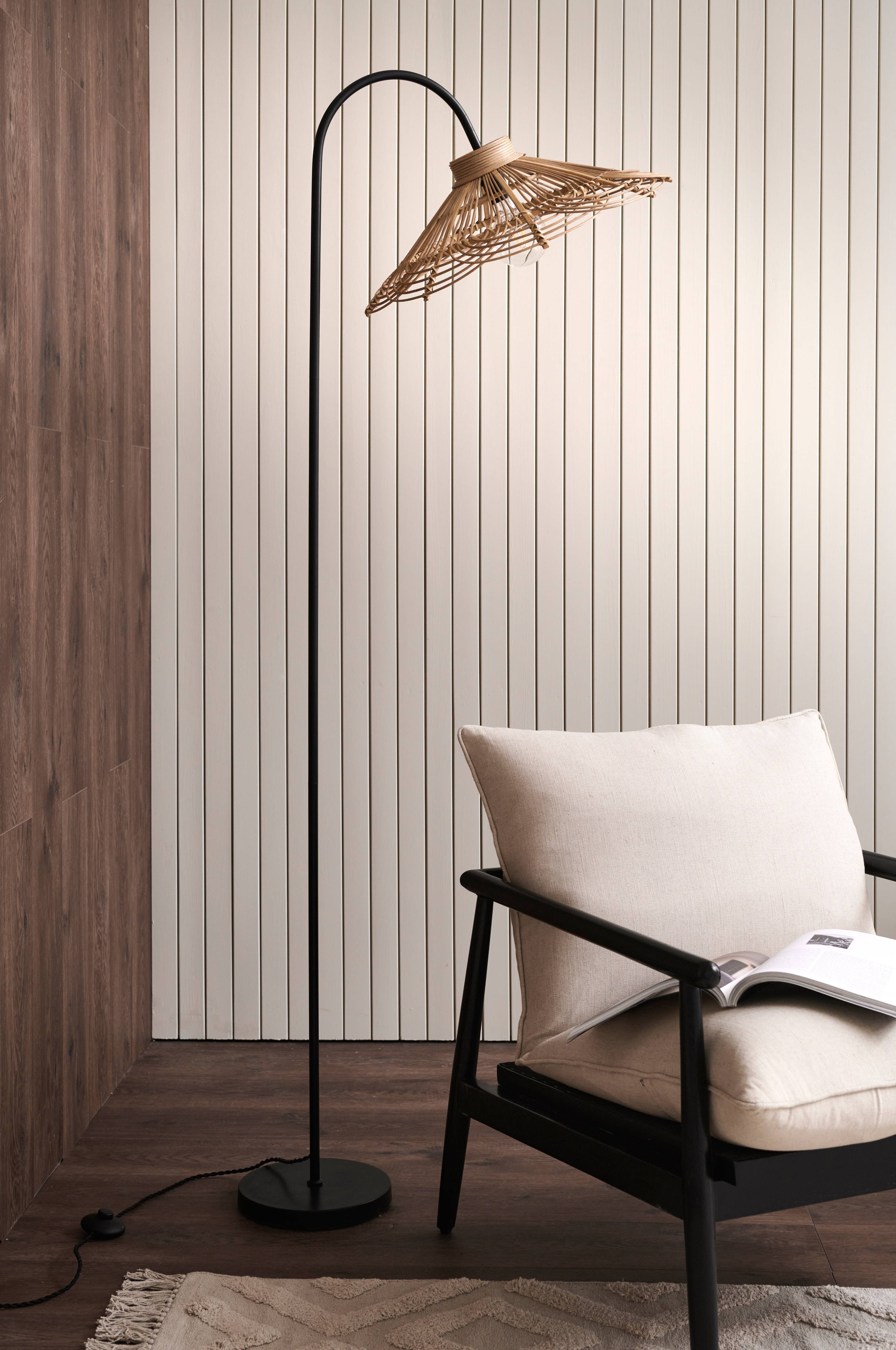Gulvlampe med skjerm av flettet naturfarget rotting. Stamme av metall i mattsvart finish.