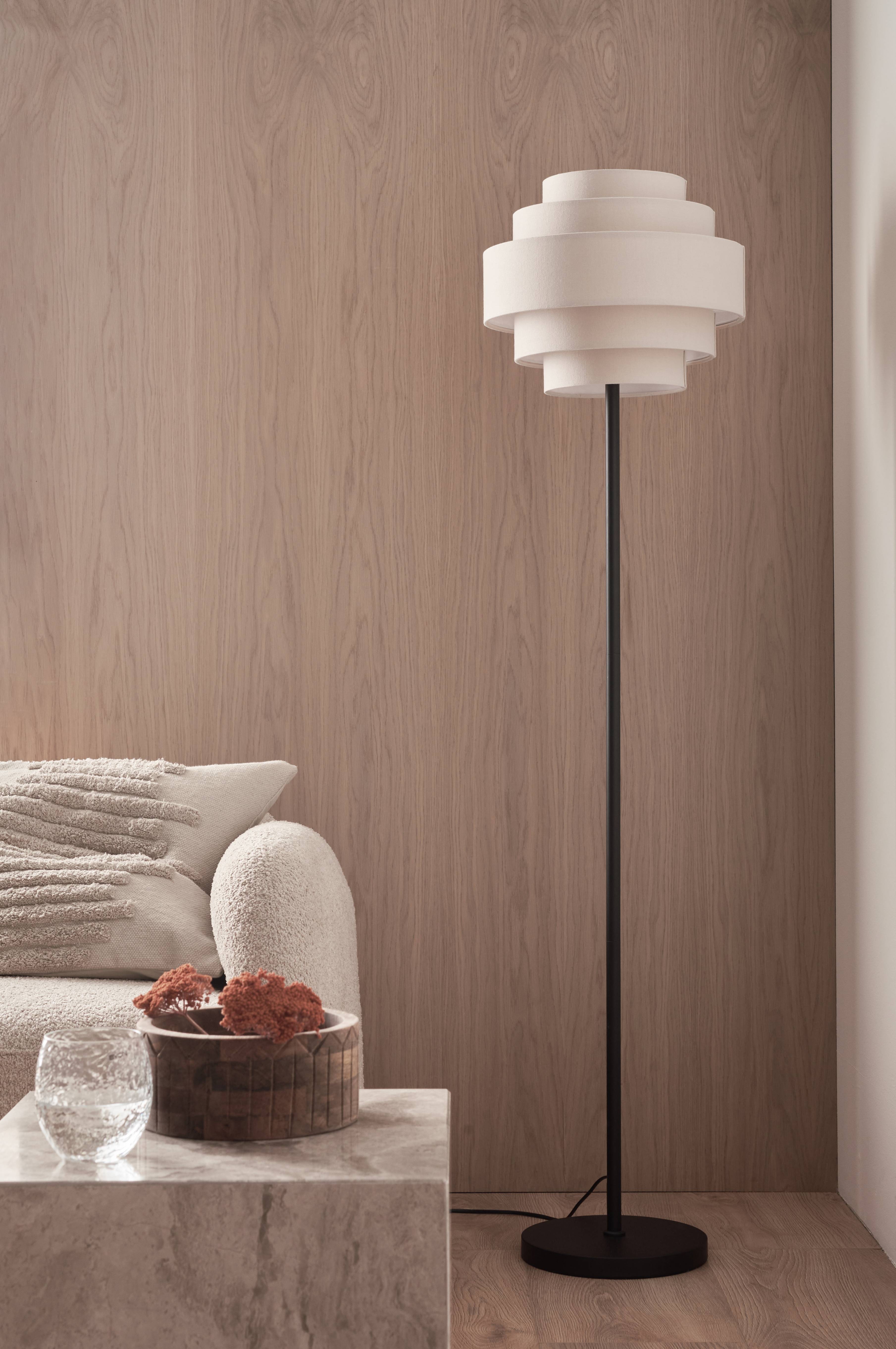 Gulvlampe med fot i mattsvart metall og skjerm av bomullsstoff i flere seksjoner og i ulike størrelser. Totalhøyde: 145 cm, hvorav lampeskjermens høyde er 28,5 cm. Svart ledning med strømbryter. Lyspære er ikke inkludert.