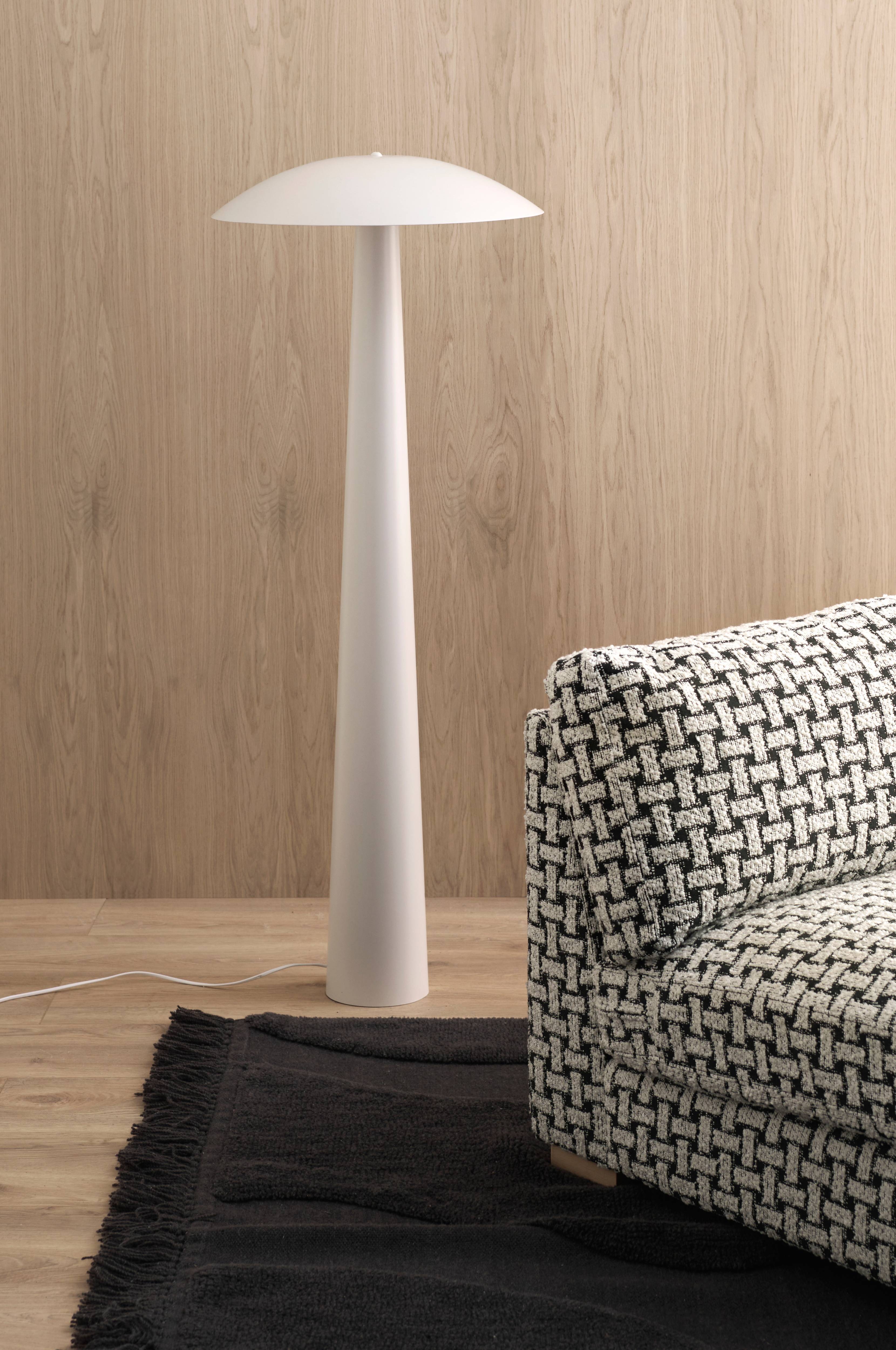 Gulvlampe av metall. Skjermens mål: Diameter 50 cm, høyde 12 cm. Lampefotens diameter nederst 10 cm. Ledning med gulvstrømbryter, ledningslengde 250 cm. Sokkel 2x E27. Lyspære er ikke inkludert.
