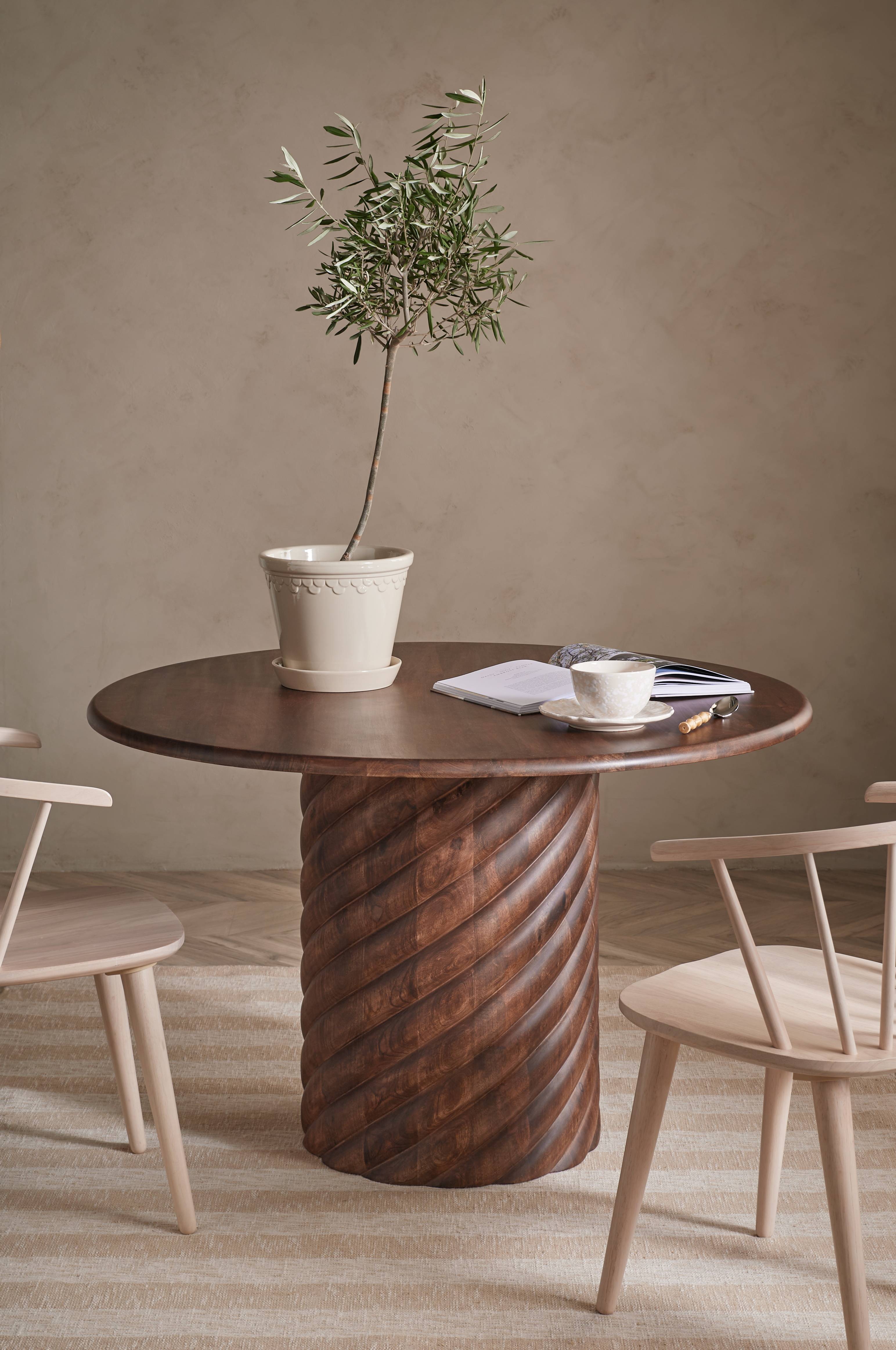 Rundt bord i mangotre med vokset overflate. Rund, stabil base med dekorativt, vridd mønster. Høyde til bordets underkant 73,5 cm.