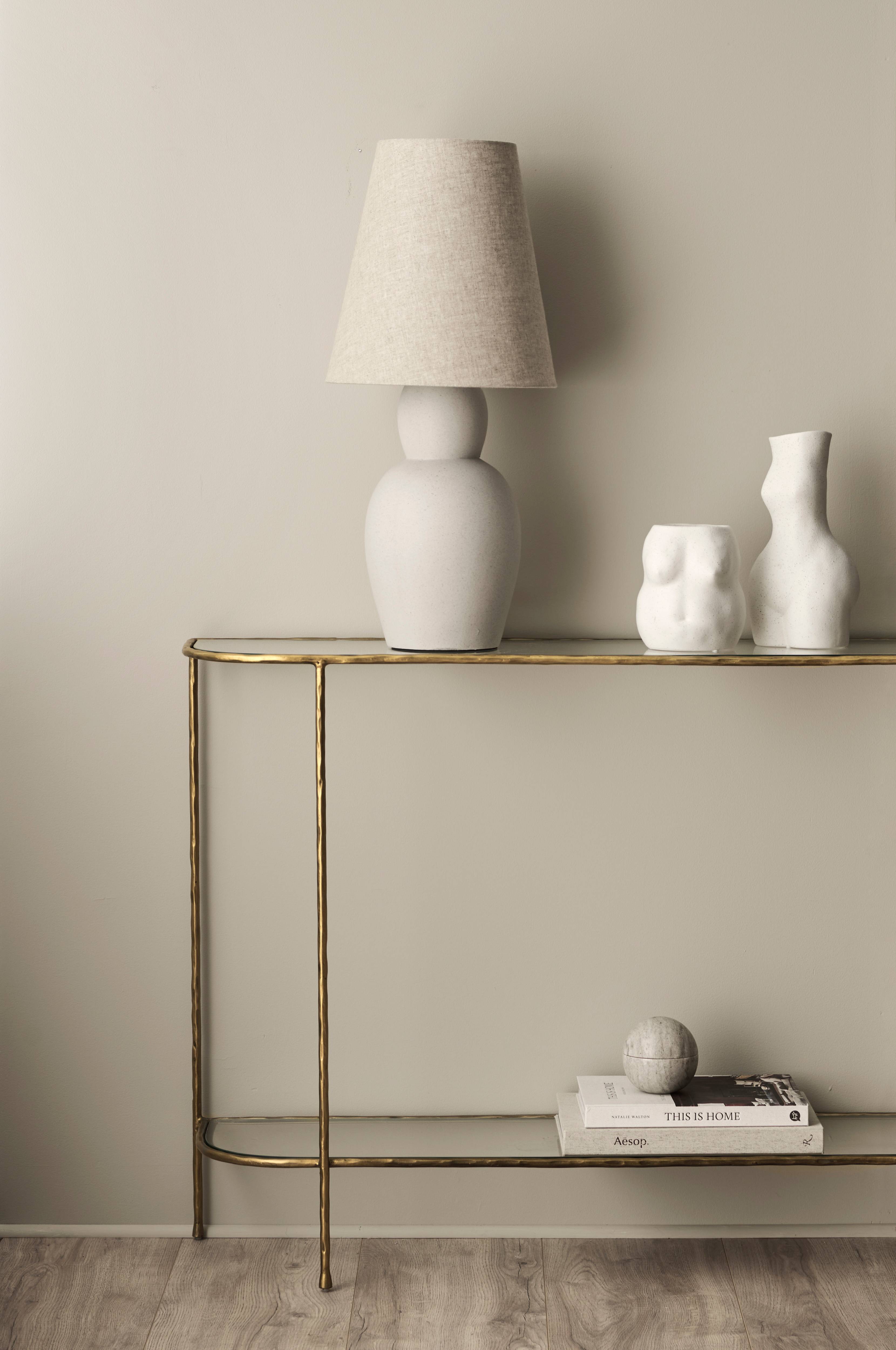 Konsollbord i metall med plater av herdet glass. Høyde mellom platene ca. 63 cm. Enklere montering.