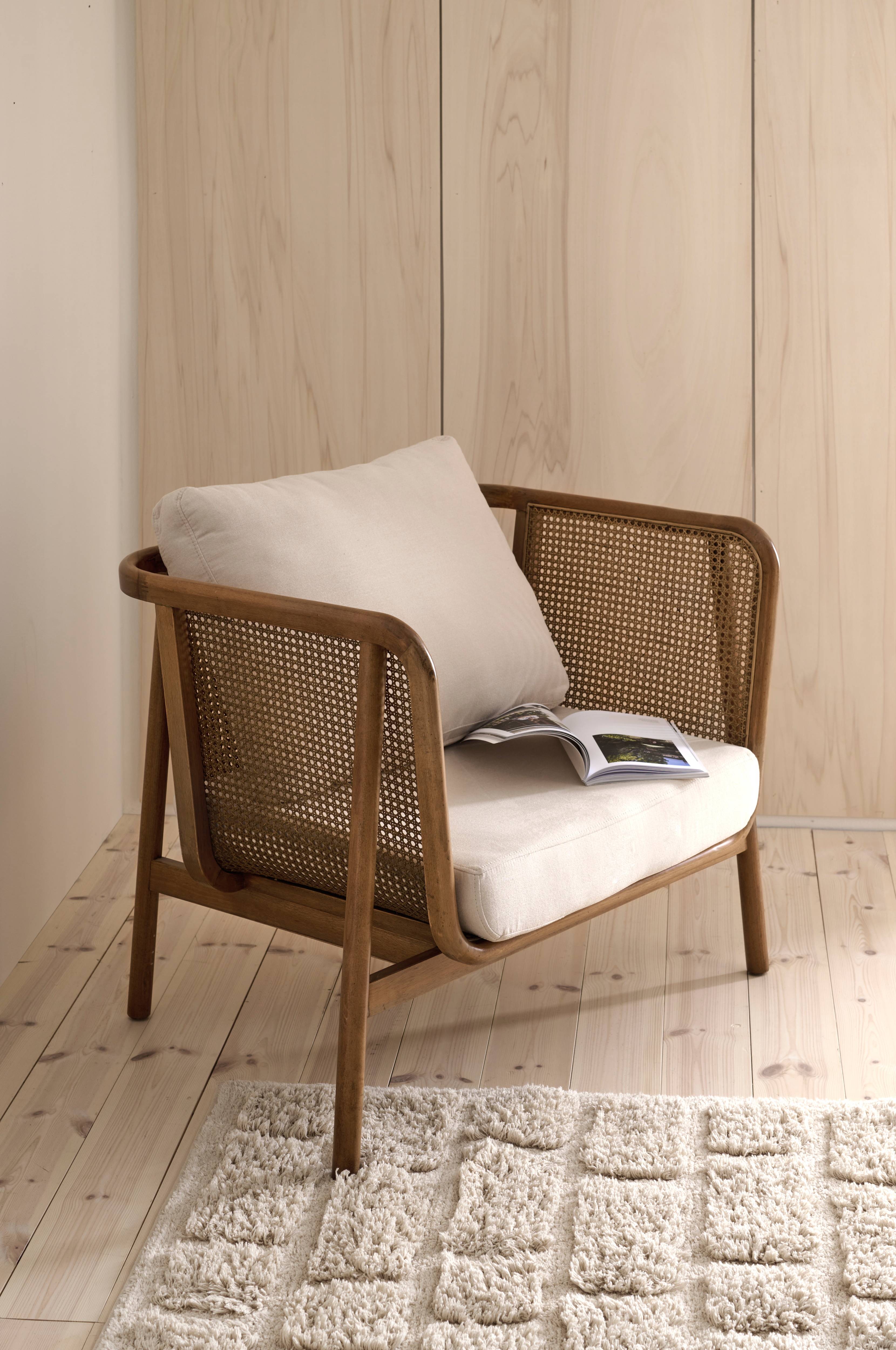 Lenestol i lakkert bøk med sider i rotting. Trekket, i polyestertekstil, på sittepute og ryggputer er avtagbart. Fyll: Skum i sitteputen og fiberbomull i ryggputen. Sittedybde 40 cm (sittedybde uten ryggpute 63 cm). Frihøyde under møbelet (benhøyde) 27 cm. Leveres montert.