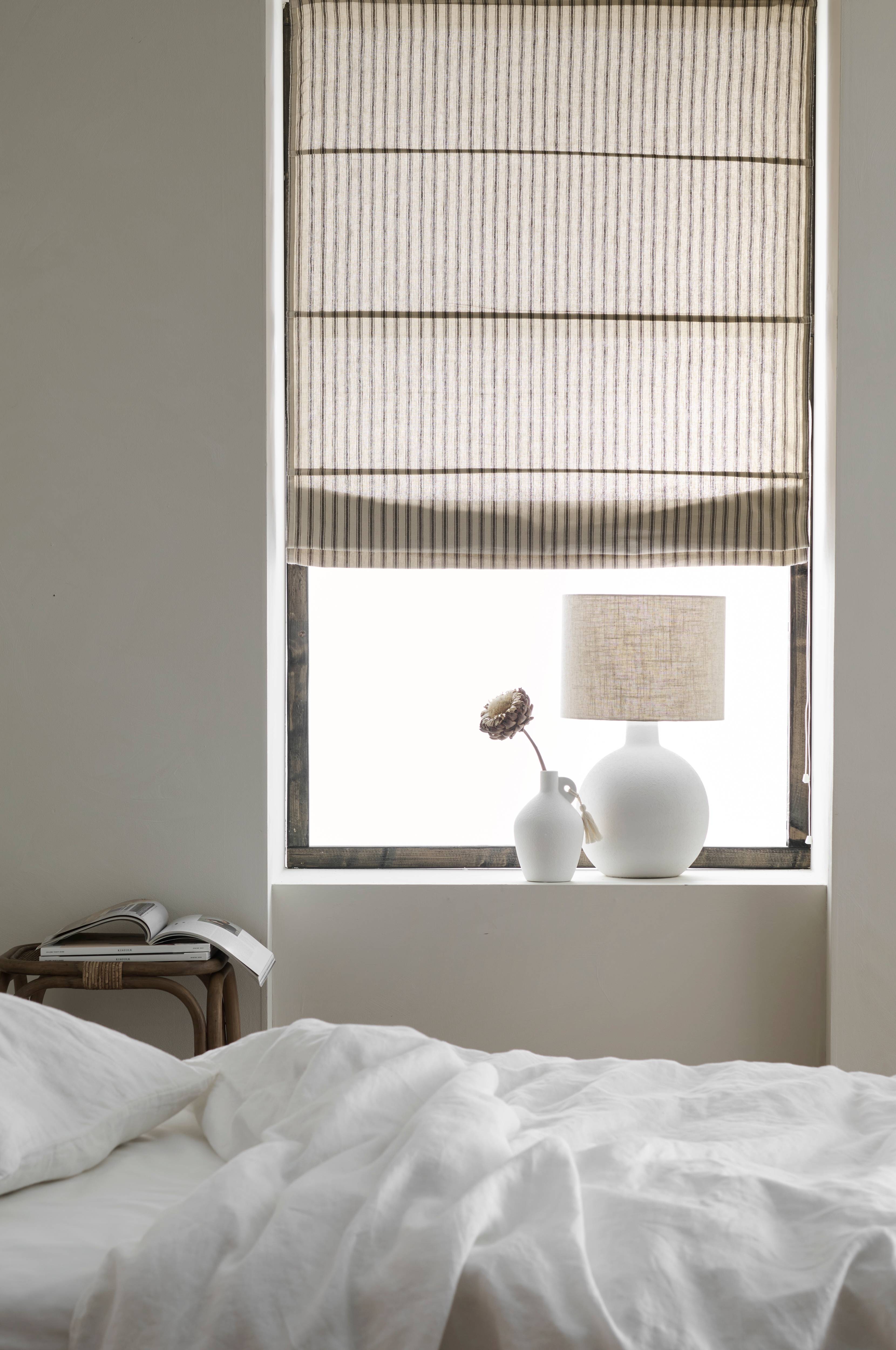 Liftgardin i økologisk bomull med garnfarget stripe. Leveres ferdig montert. Stabil konstruksjon med trepinne øverst og snorer som løper gjennom tverrgående pinner. Kroker for oppheng medfølger. Lengde 160 cm. Kommer i flere ulike bredder.
