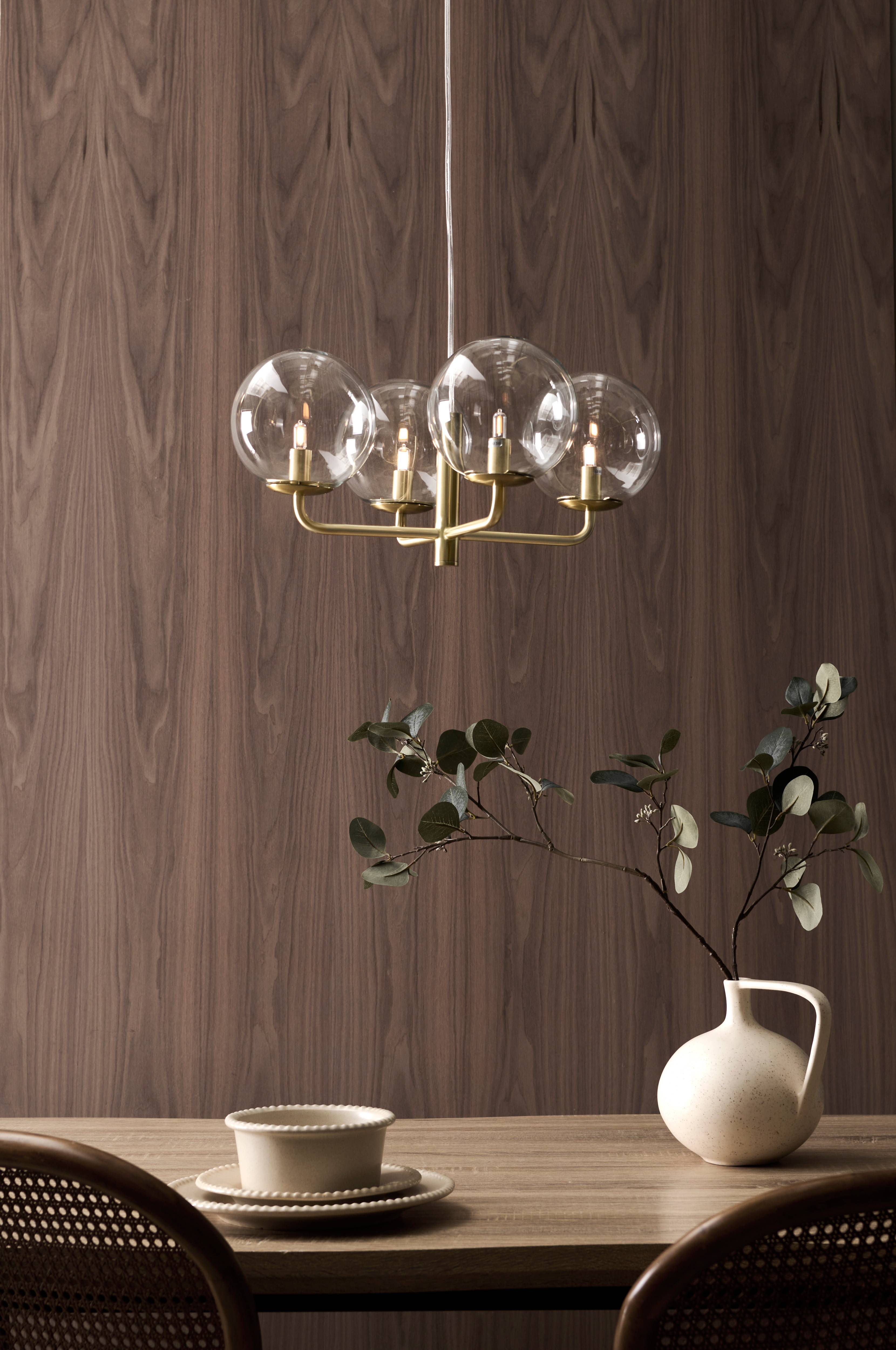 Lysekrone av metall med 4 glasskjermer. Total høyde fra tak ca. 110 cm, kan kortes til ønsket høyde. Mål, glasskjermer: Diameter 15 cm. Sokkel 4xG9. Transparent ledning. Krokoppheng.