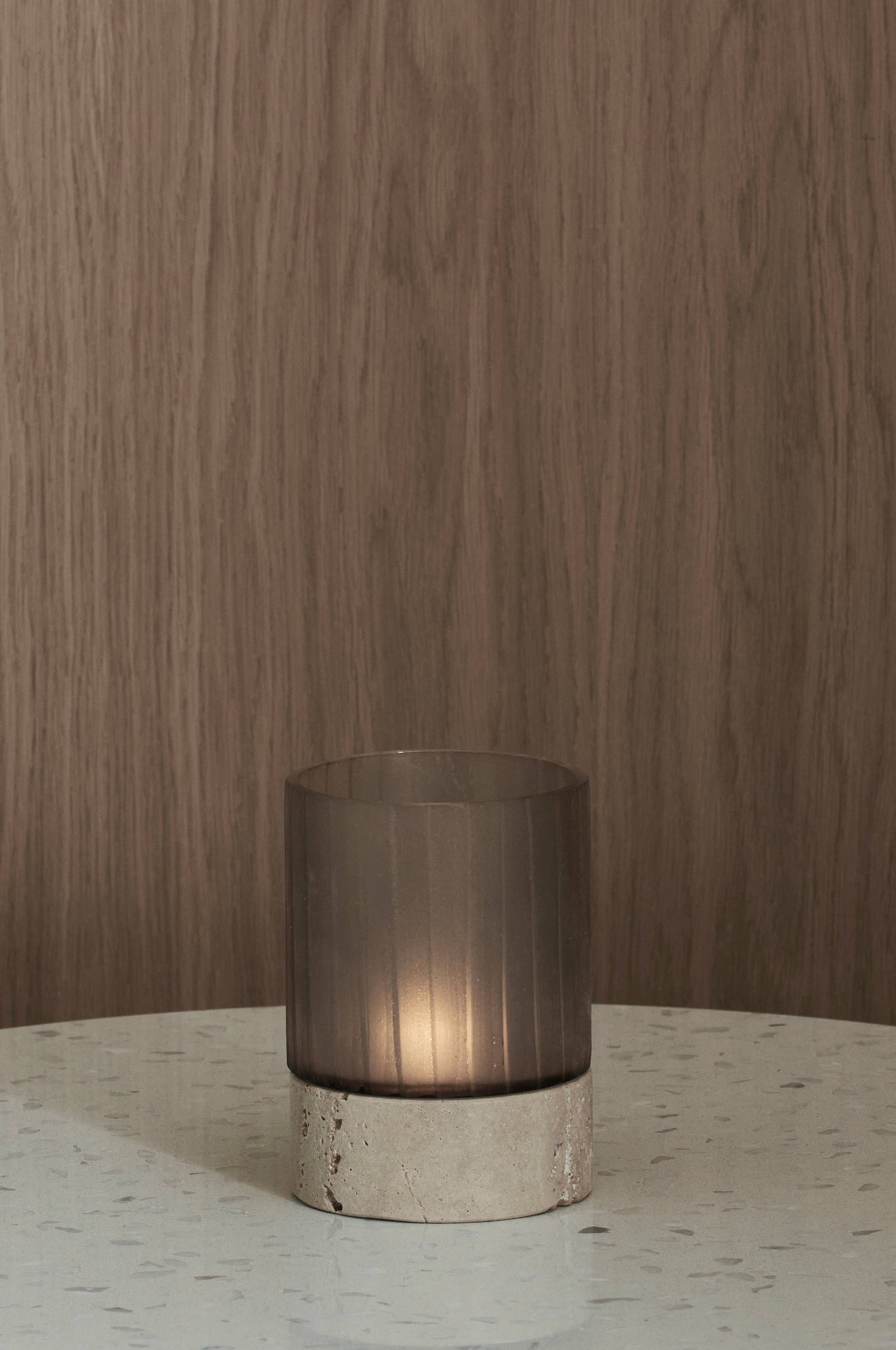 Lyslykt i 2 deler. Lykten er av glass med frostet finish, og sitter i en holder av travertin.