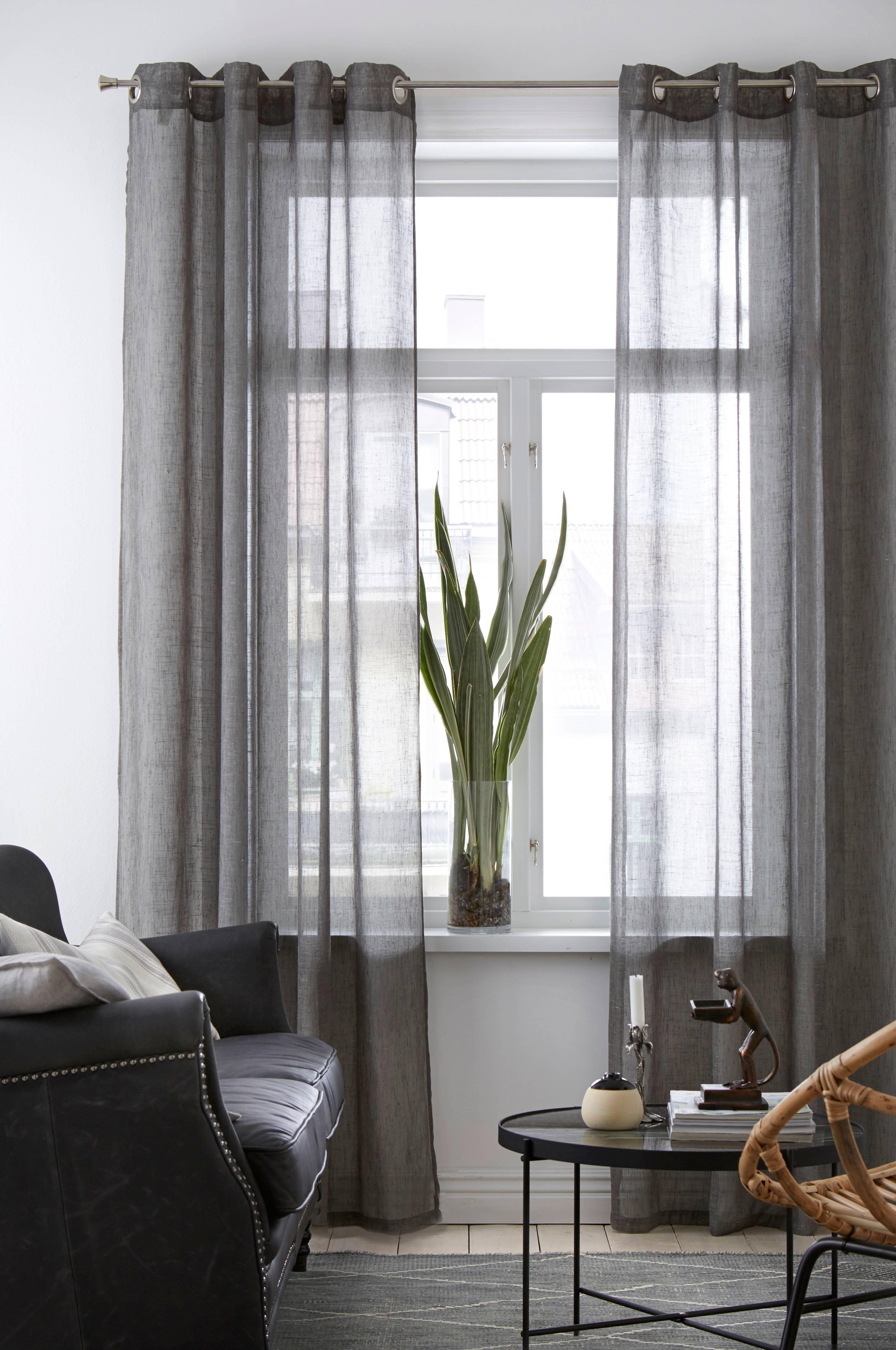 med maljer i sølvfarget metall. Voile med linfølelse i 85% polyester og 15% lin med slubbe-effekt. Vask 30°. Bredde 140 cm.