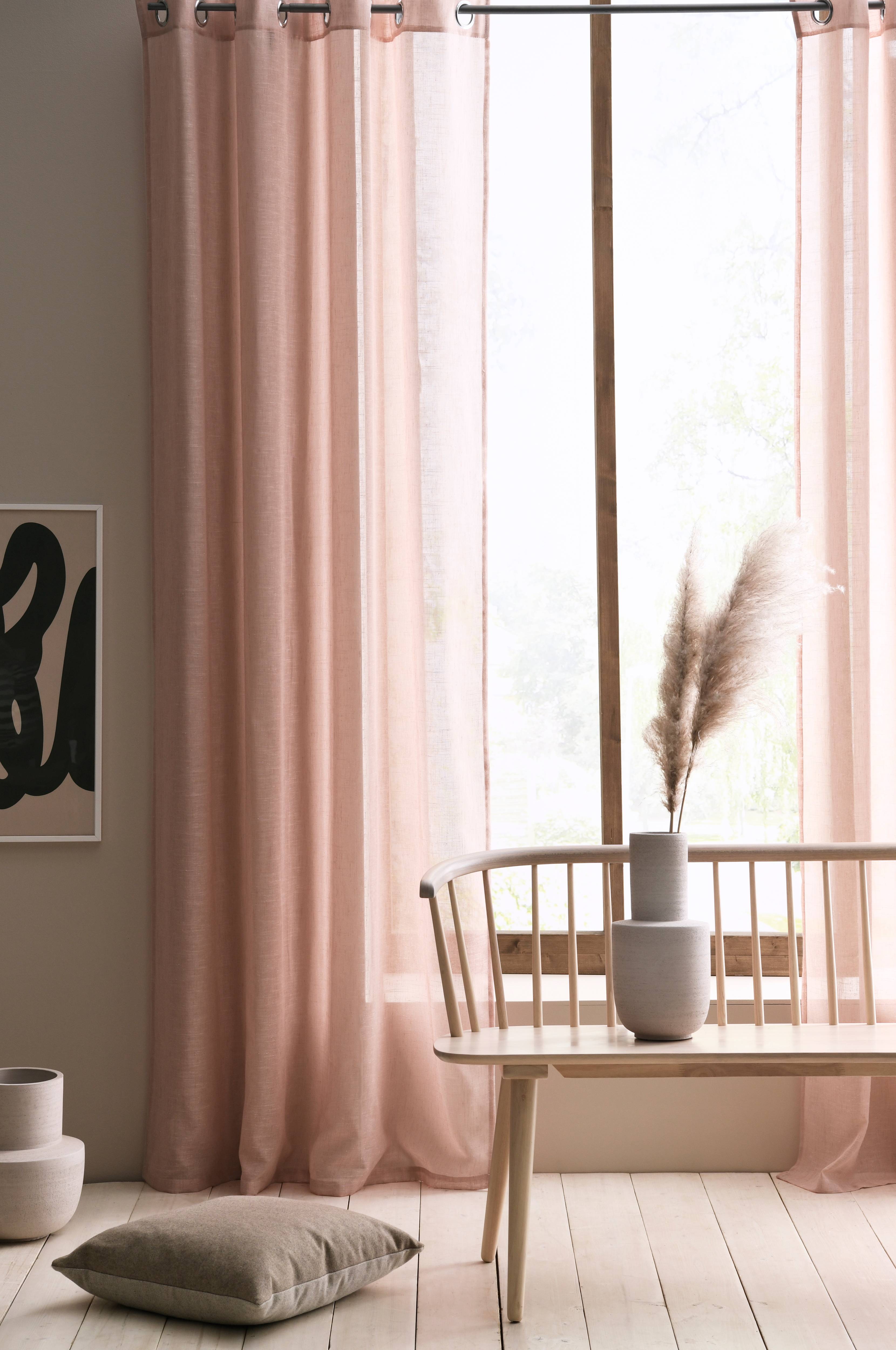 med maljer i sølvfarget metall. Voile med linfølelse i 85% polyester og 15% lin med slubbe-effekt. Vask 30°. Bredde 140 cm.