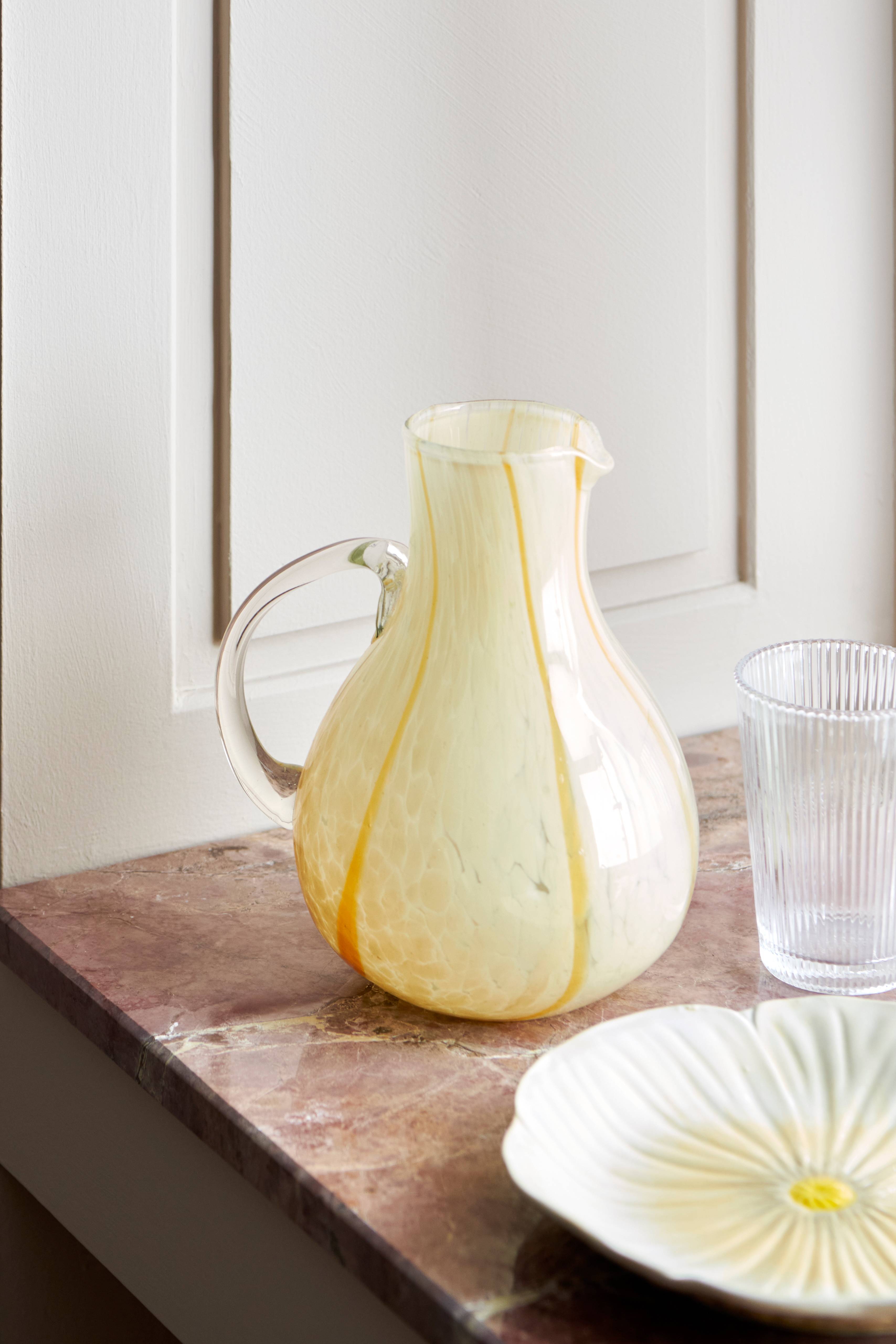 • Mugge i glass med dekorativt mønster• Største diameter: 15 cm• Diameter oventil: 7 cm• Mengde: 1,5 l• Mindre variasjoner i mønster og farger kan forekomme i forhold til bildet, noe som gjør hver kanne unik.