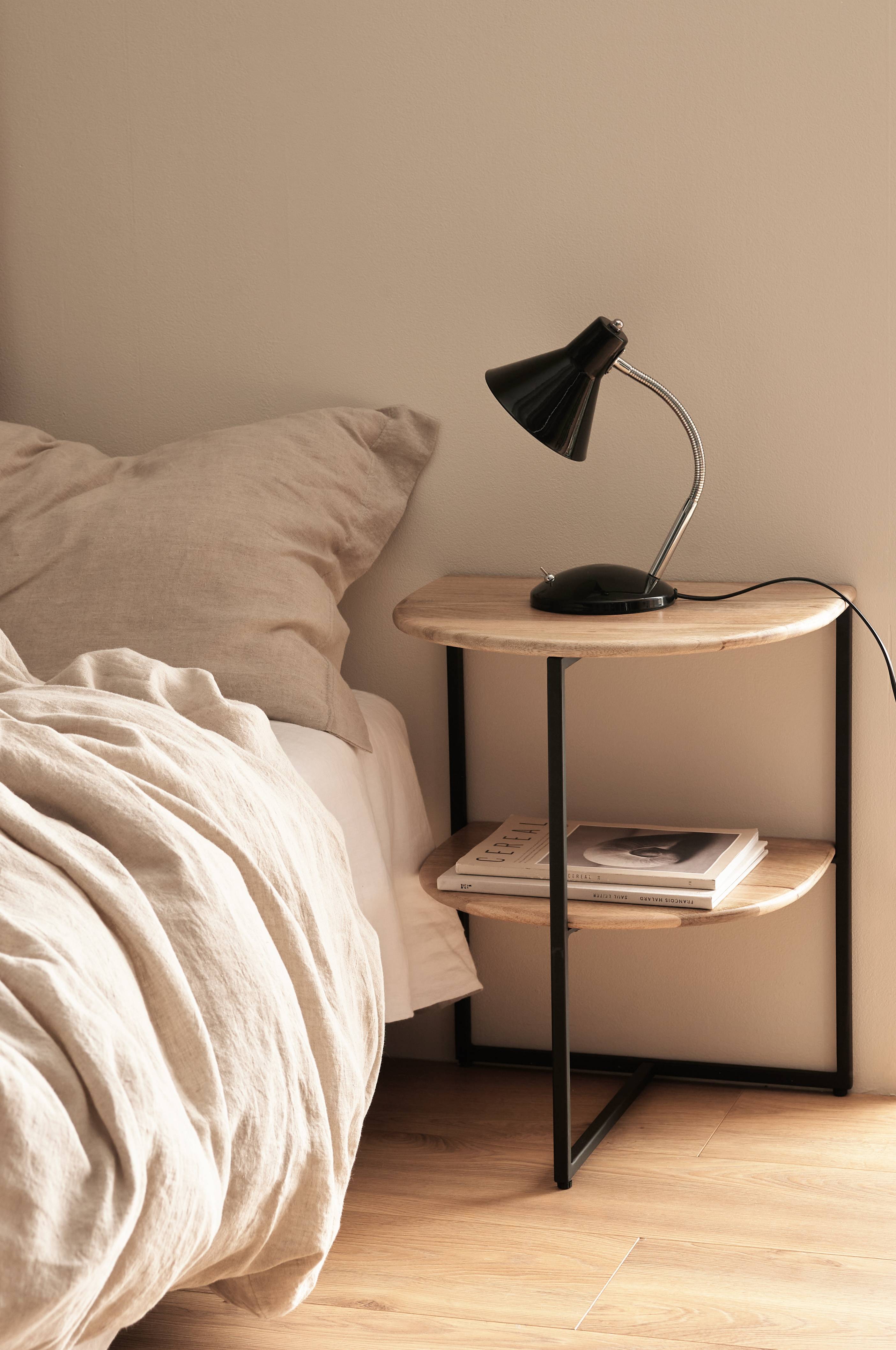 Nattbord / sidebord med stativ av pulverlakkert metall. Plater av mangotre. Høyde mellom platene 25,5 cm. Frihøyde under møbelet 26 cm.