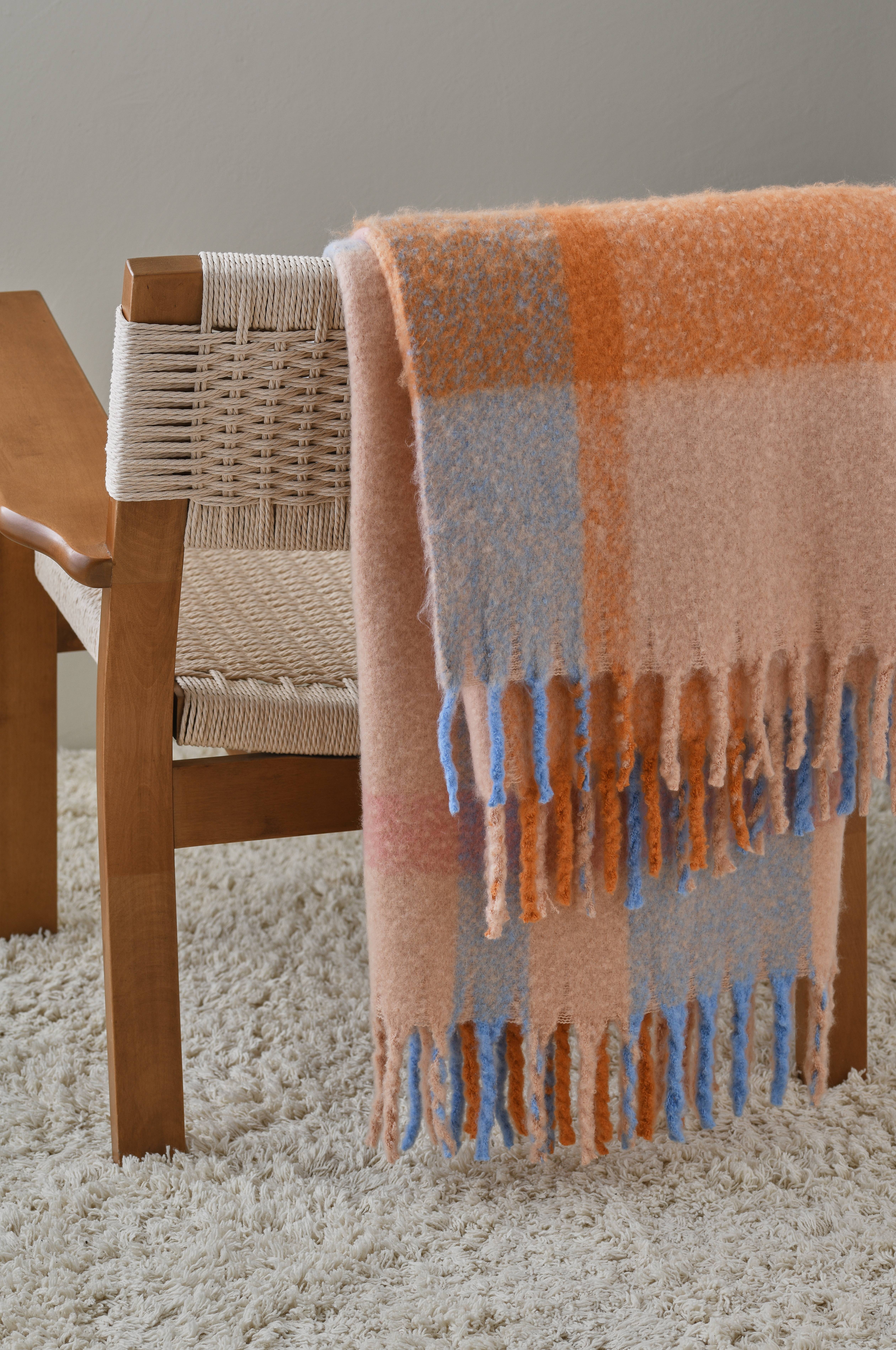 Mykt, deilig pledd med garnfargede ruter og frynser på kortsidene. Str. 130x170 cm + 15 frynser.