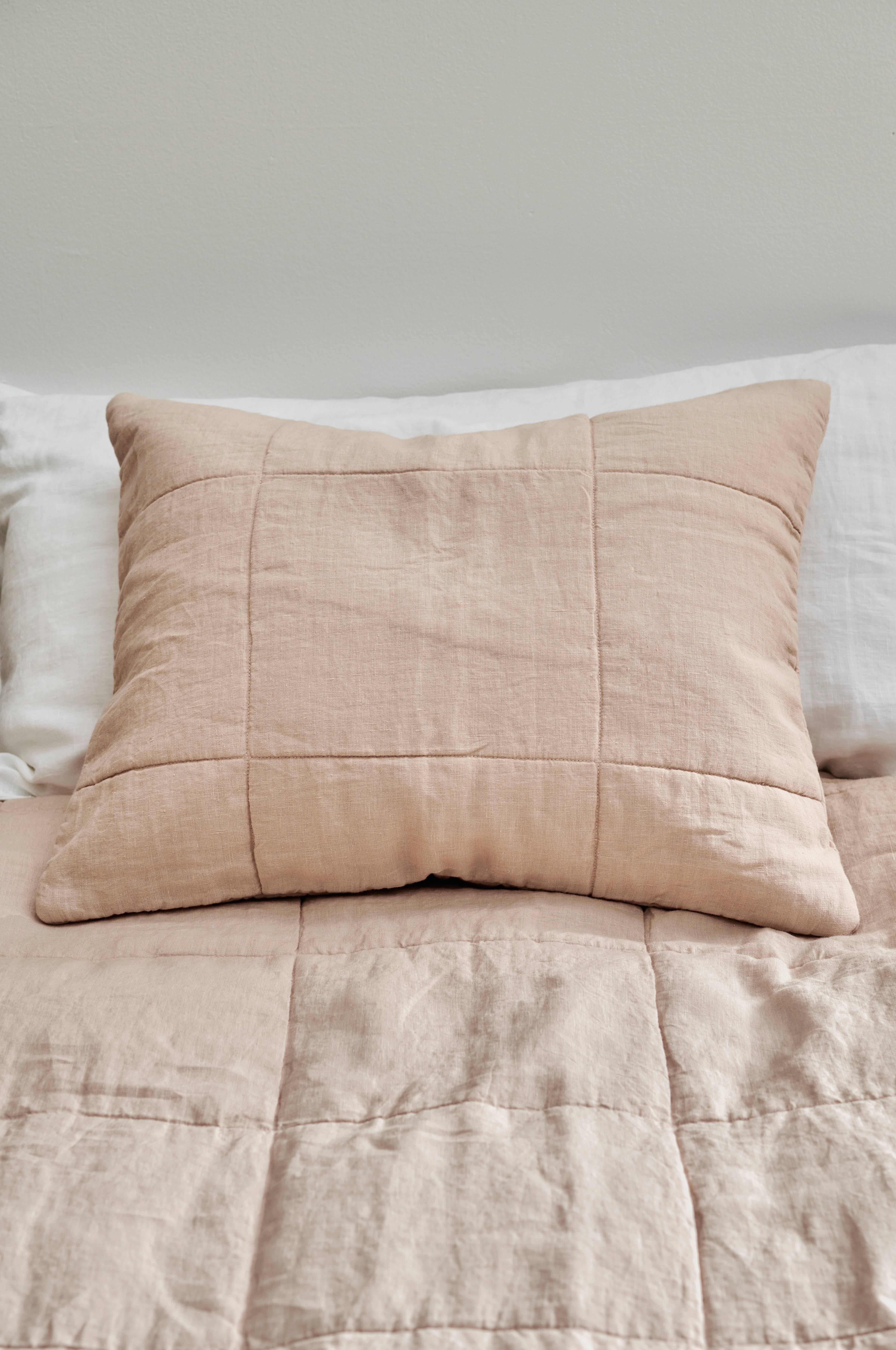 Lett, rutequiltet putetrekk med forside i vasket lin. Bakside av bomull. Glidelås. Str 50x60 cm.