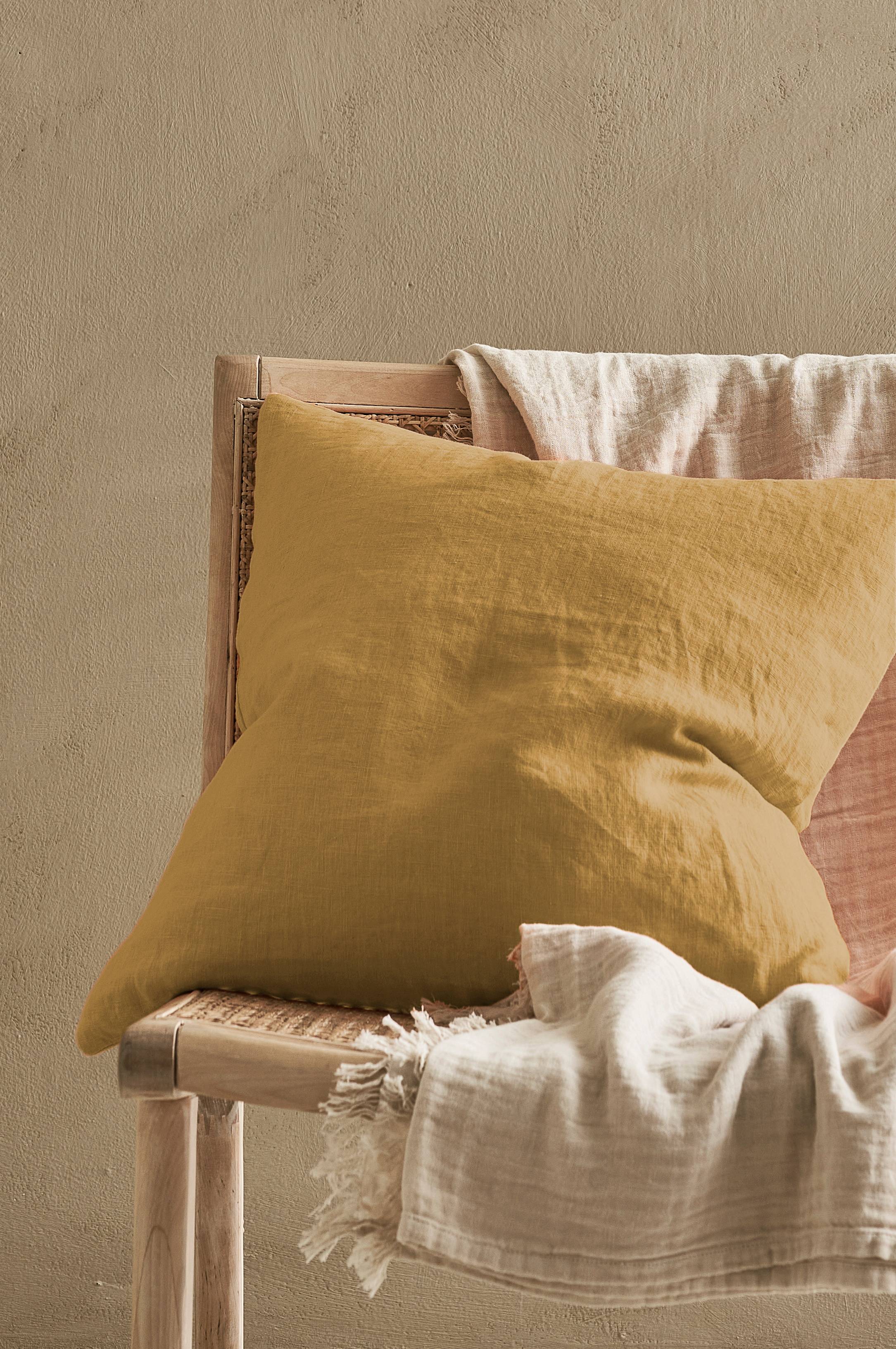 Enkel og klassisk putetrekk i matt sennepsgul farge. Passet veldig godt med de blomstrete putetrekkene i lin som jeg kjøpte fra Ellos. Størrelse 50 x 50 stemmer.
