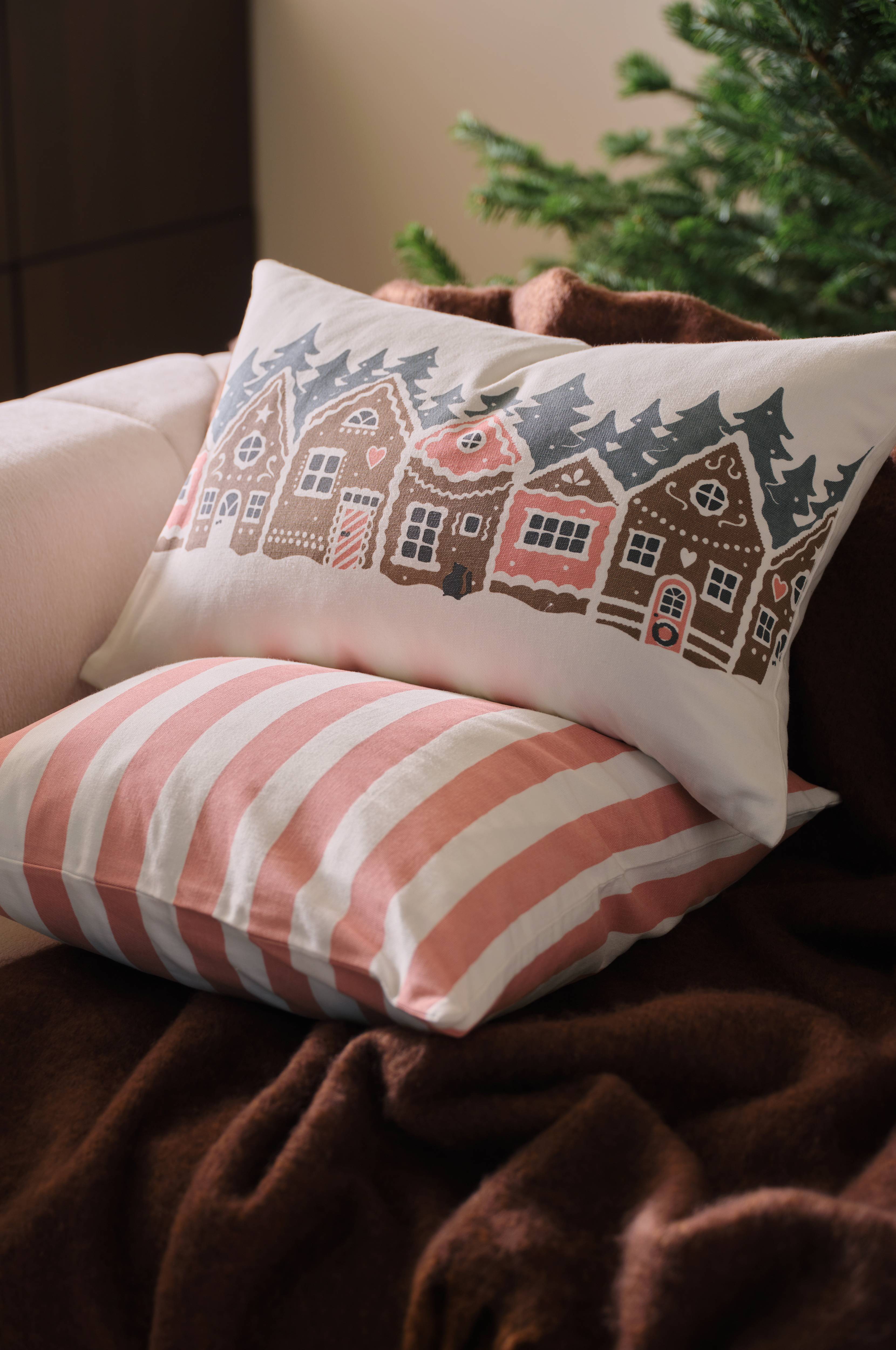 • To putetrekker i noe sterkere semi-panama• Putetrekk 1: Striper på begge sider, 50x50 cm• Putetrekk 2: Trykt på forsiden og ensfarget på baksiden, 60x40 cm