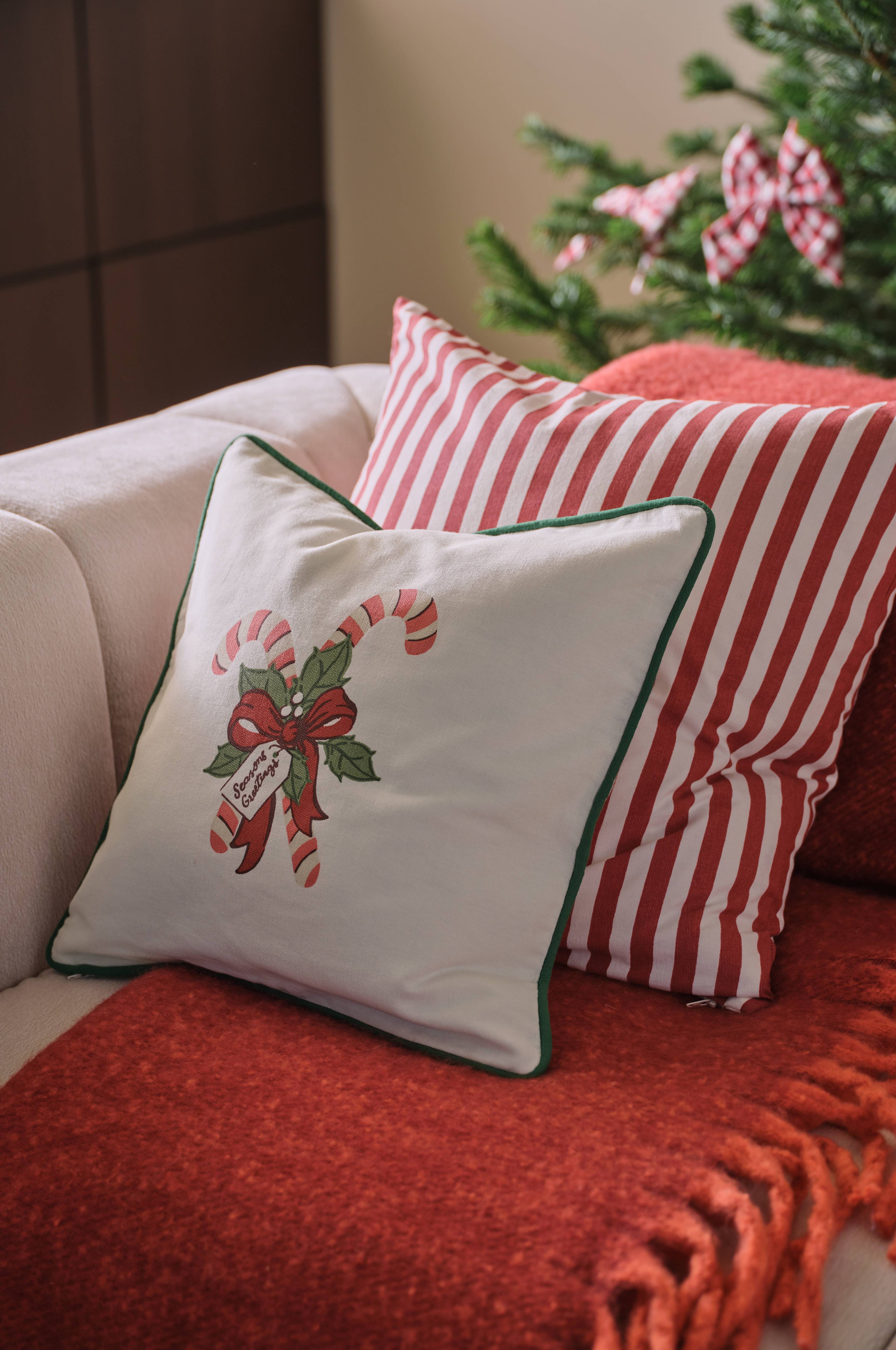 • To putetrekker i noe sterkere semi-panama• Putetrekk 1: Striper på begge sider, 50x50 cm• Putetrekk 2: Trykt på forsiden og paspelkant, 40x40 cm