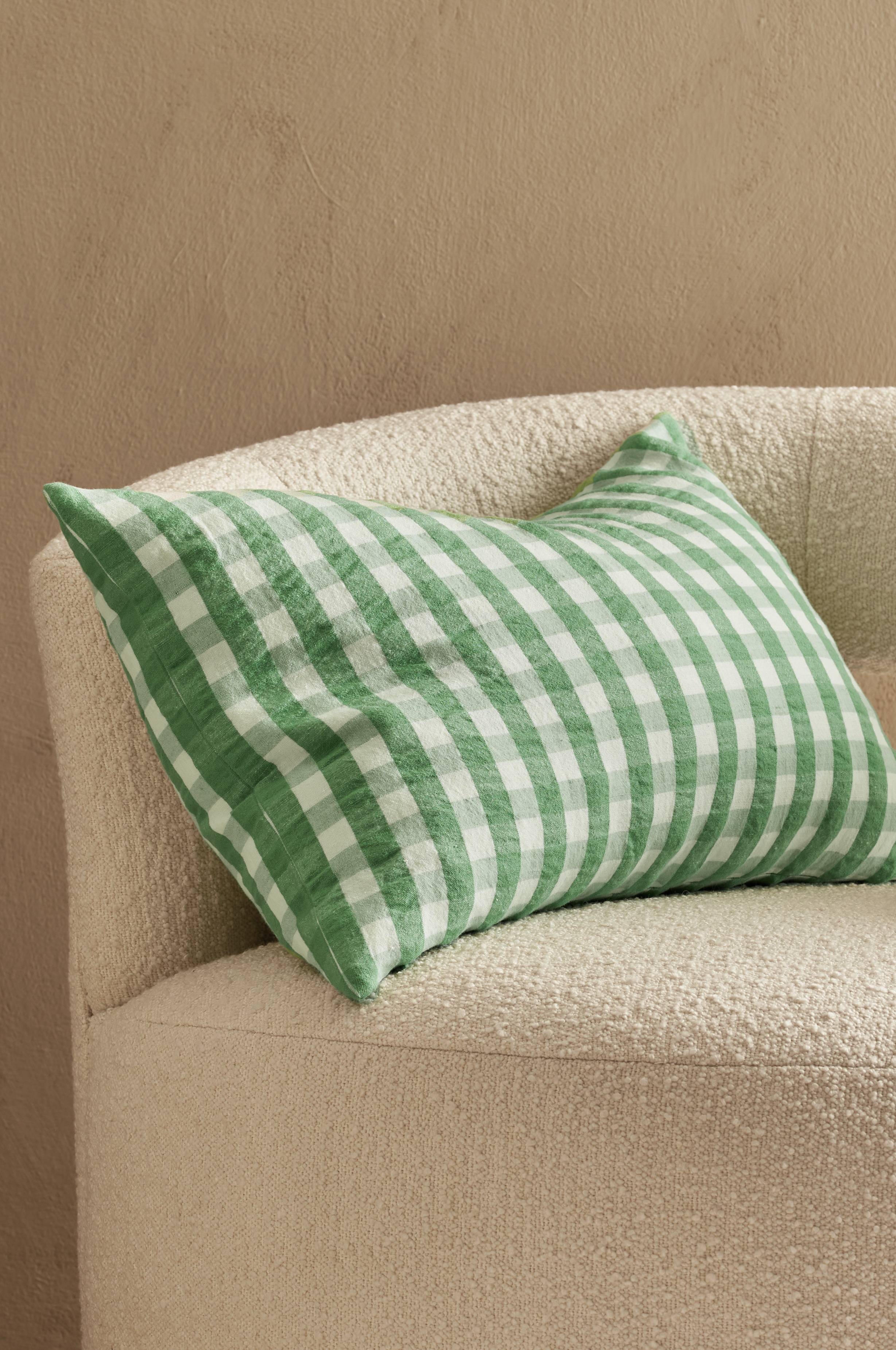 Putetrekk i krepp (seersucker) med lett tekstur i stoffet. Vasket kvalitet i en blanding av bomull og hamp med garnfargede ruter. Skjult glidelås i bunnen.