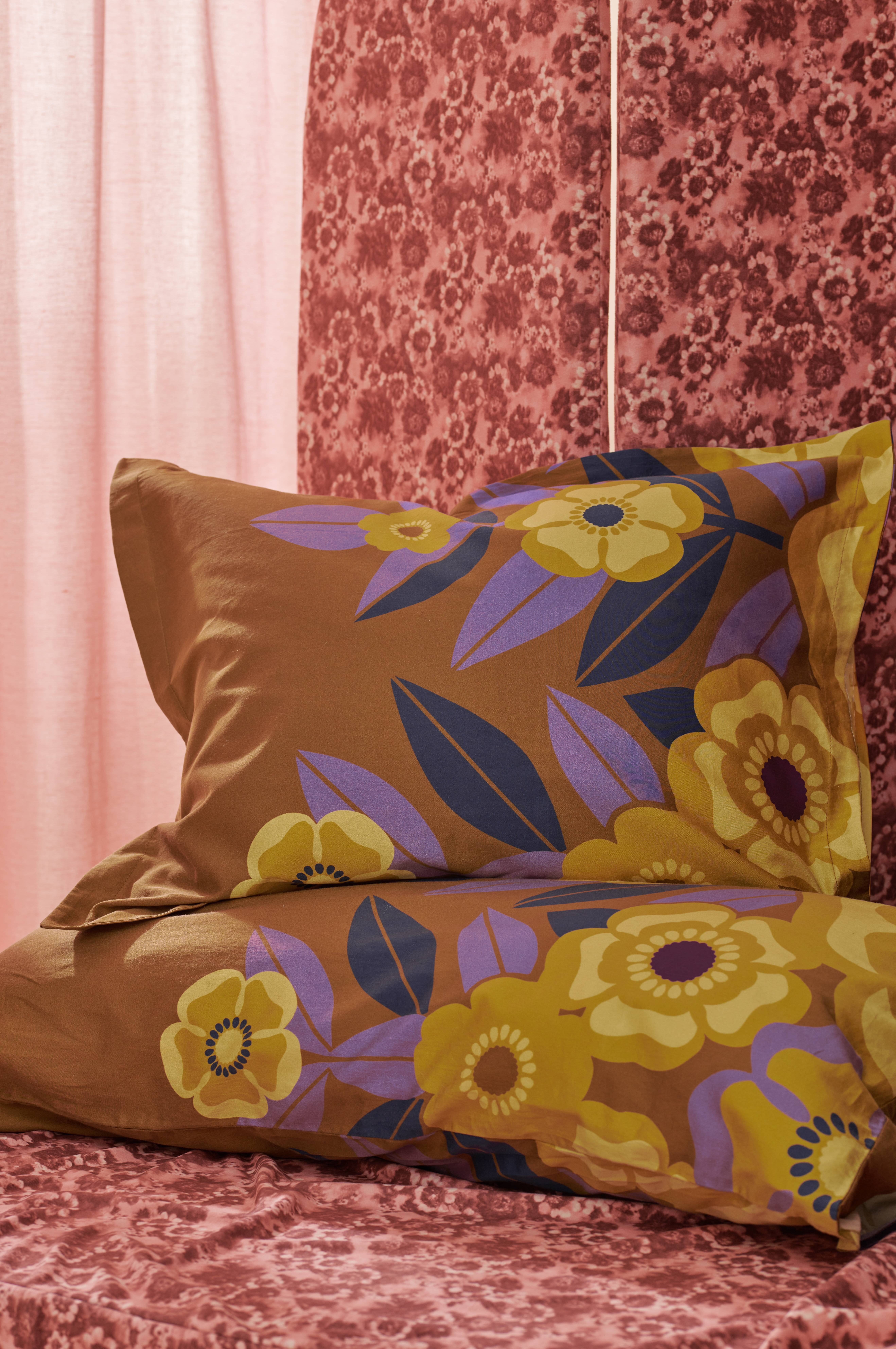 Putevar i vasket sateng av økologisk bomull med trykt blomstermønster. Trådtetthet 300 tc. Putevaret leveres i en stoffveske med samme kvalitet og mønster. Størrelse 50x60 cm + 3 cm vinge rundt.