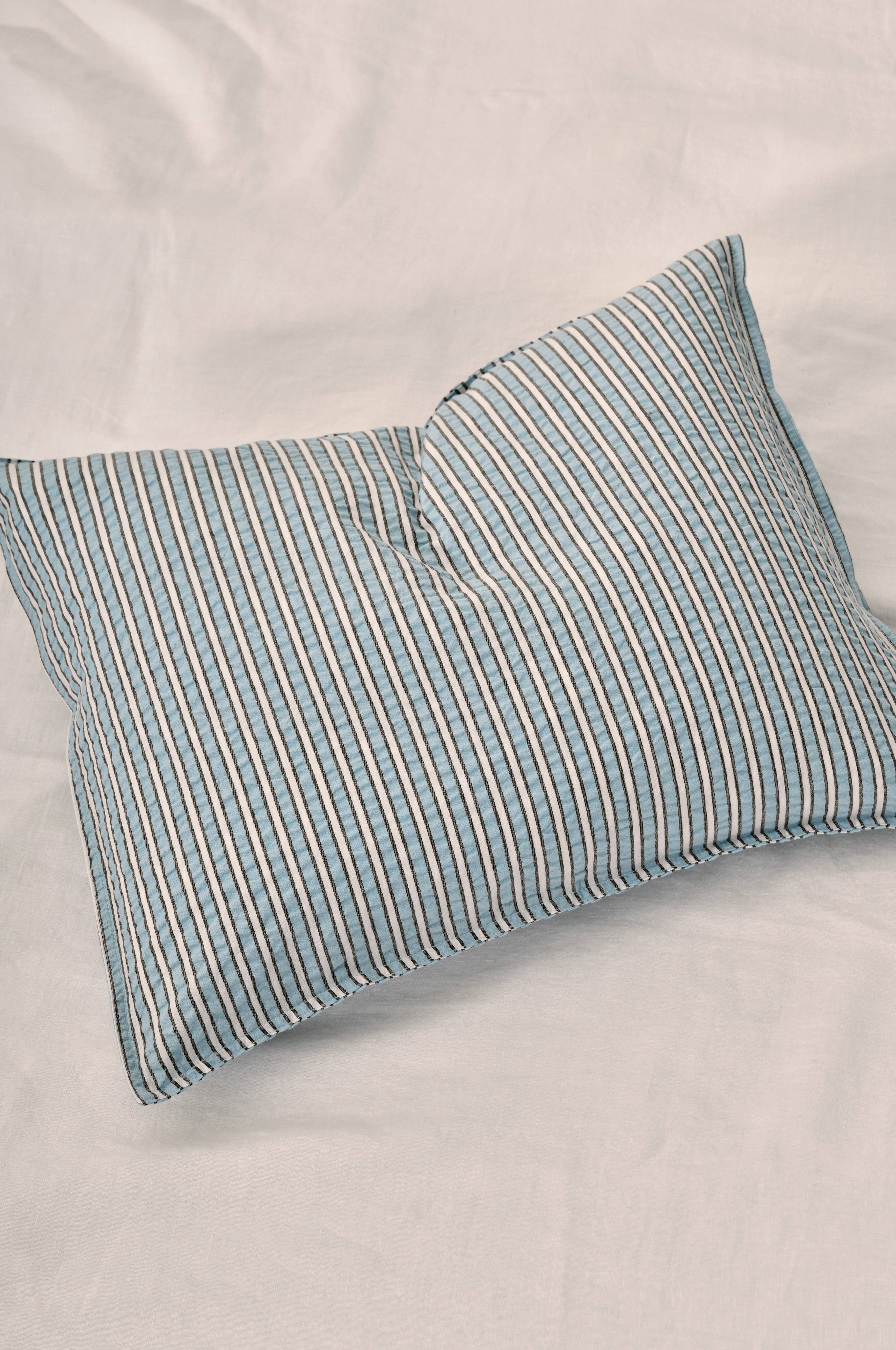 Putevar i seersucker (krepp) av økologisk bomull. Dobbel jeanssøm rundt. Trådtetthet 144 tc. Størrelse 50x60 cm. Innbrett 25 cm.