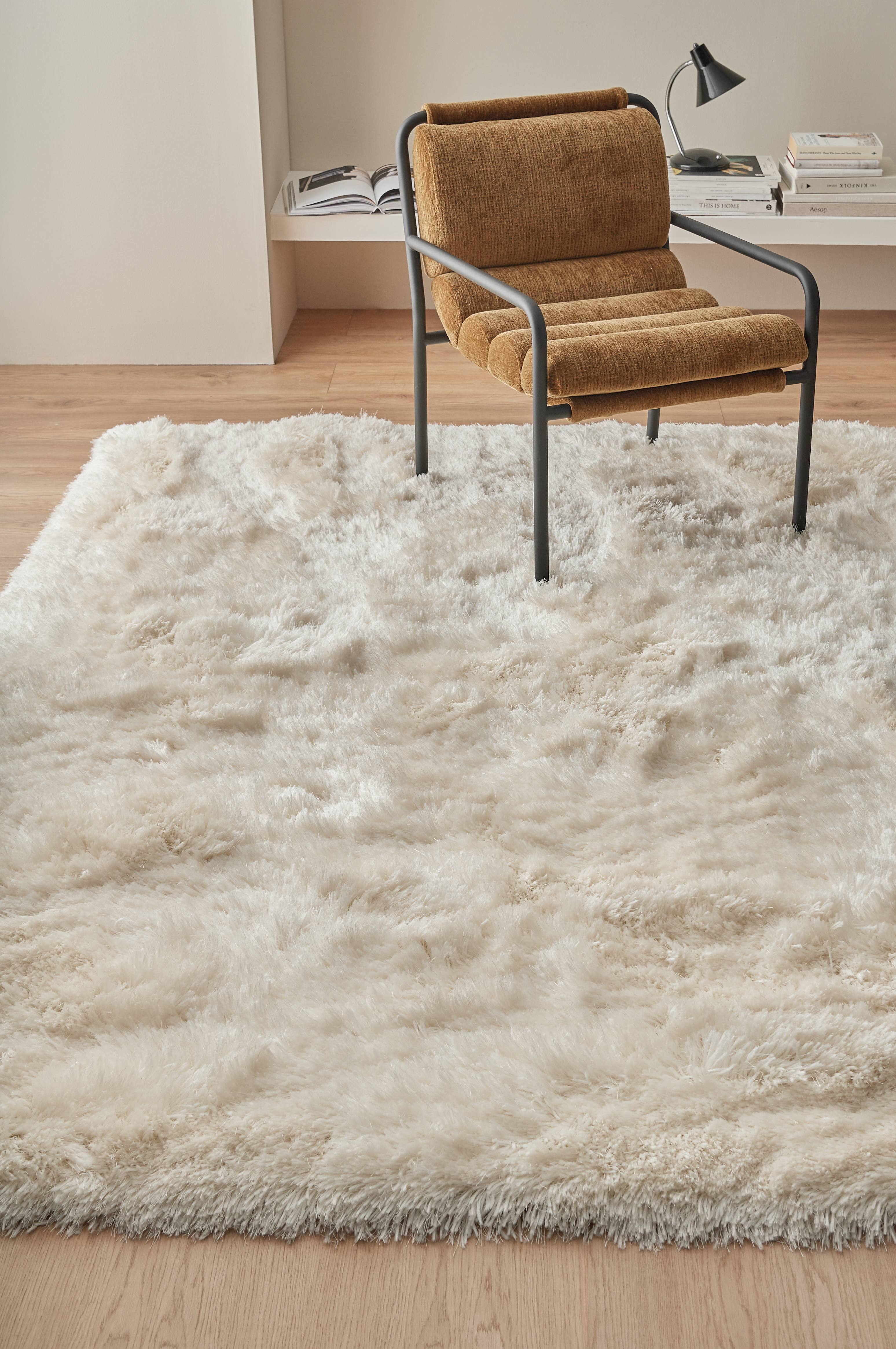 Ryeteppe med svært myk og tett lugg i to ulike garn, et matt og et blankt, som gir et livfullt inntrykk. Lugghøyde 7 cm.