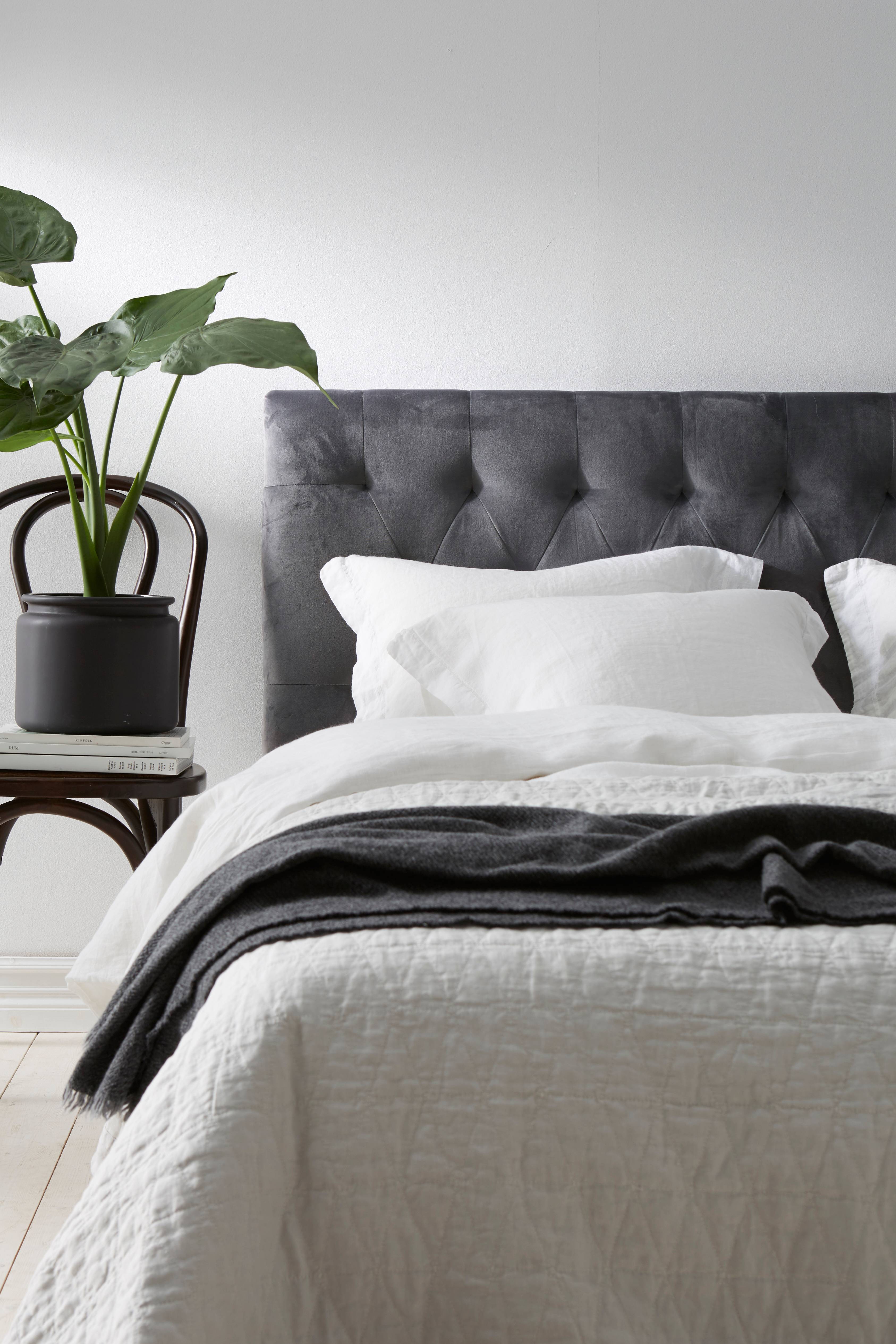 Stoppet sengegavl som festes på veggen (veggfester inngår). Stamme av tre. Trekk i fløyel av polyester og fyll av polyeter. Bredde 185 cm. Høyde 60 cm. Dybde 8 cm.