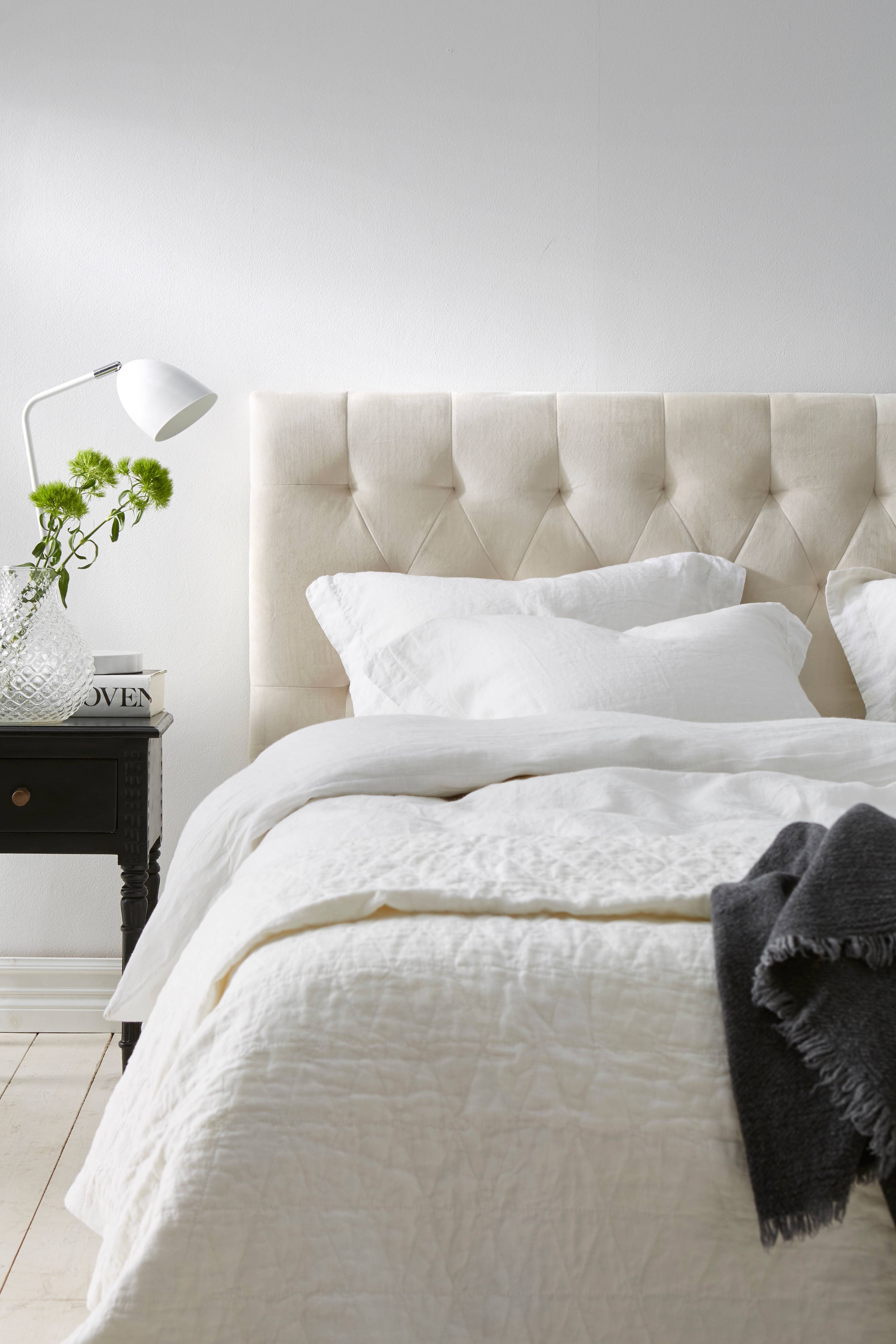 Stoppet sengegavl som festes på veggen (veggfester inngår). Stamme av tre. Trekk i fløyel av polyester og fyll av polyeter. Bredde 185 cm. Høyde 60 cm. Dybde 8 cm.