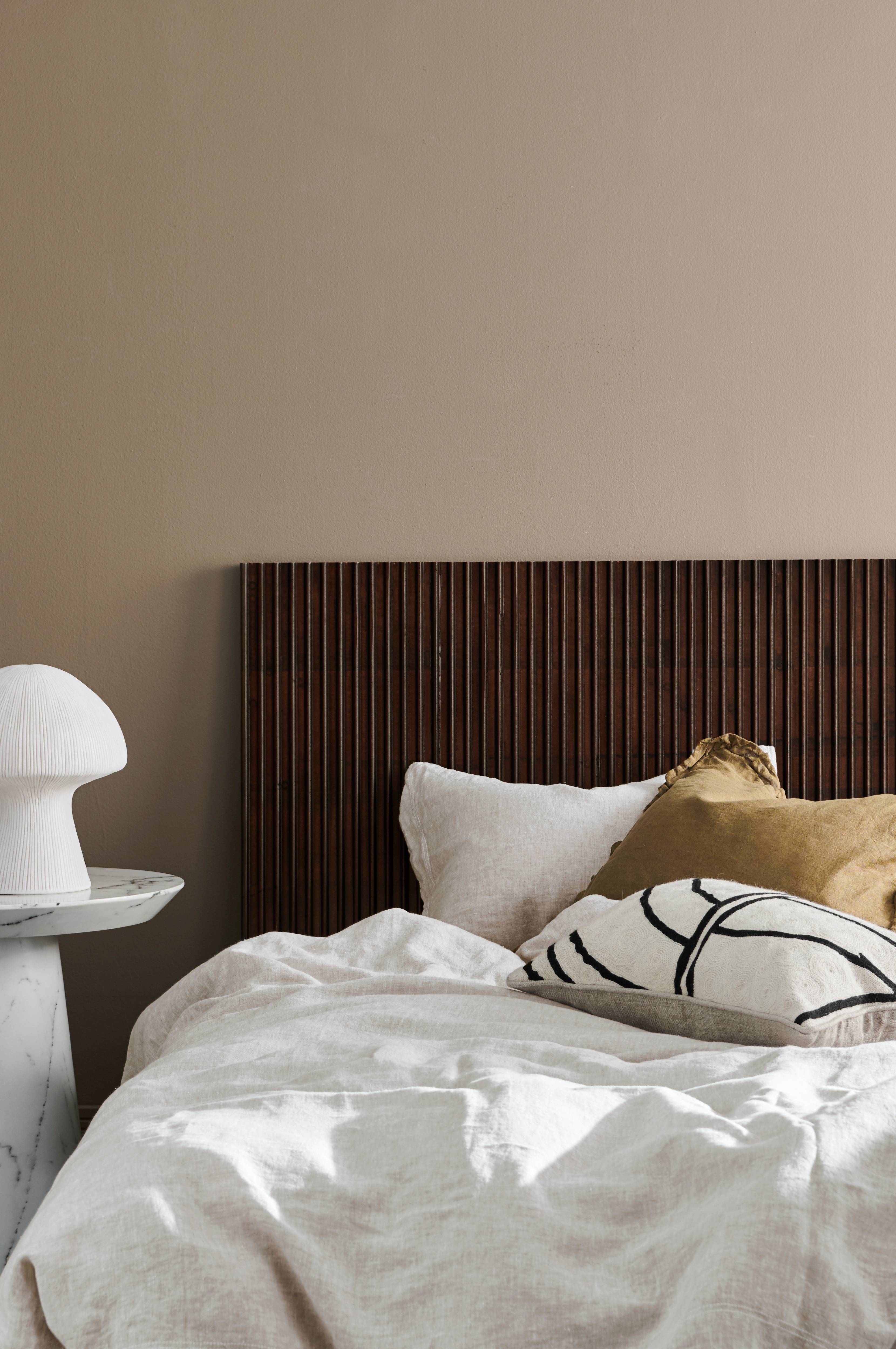 Sengegavl i mangotre med rillet mønster foran. Avrundet jern på baksiden som hindrer trematerialet fra å vri seg eller sprekke. 3 stk. nøkkelhullsfester bak for veggoppheng. Mål: Bredde 183 cm, høyde 60 cm, dybde 2,5 cm.