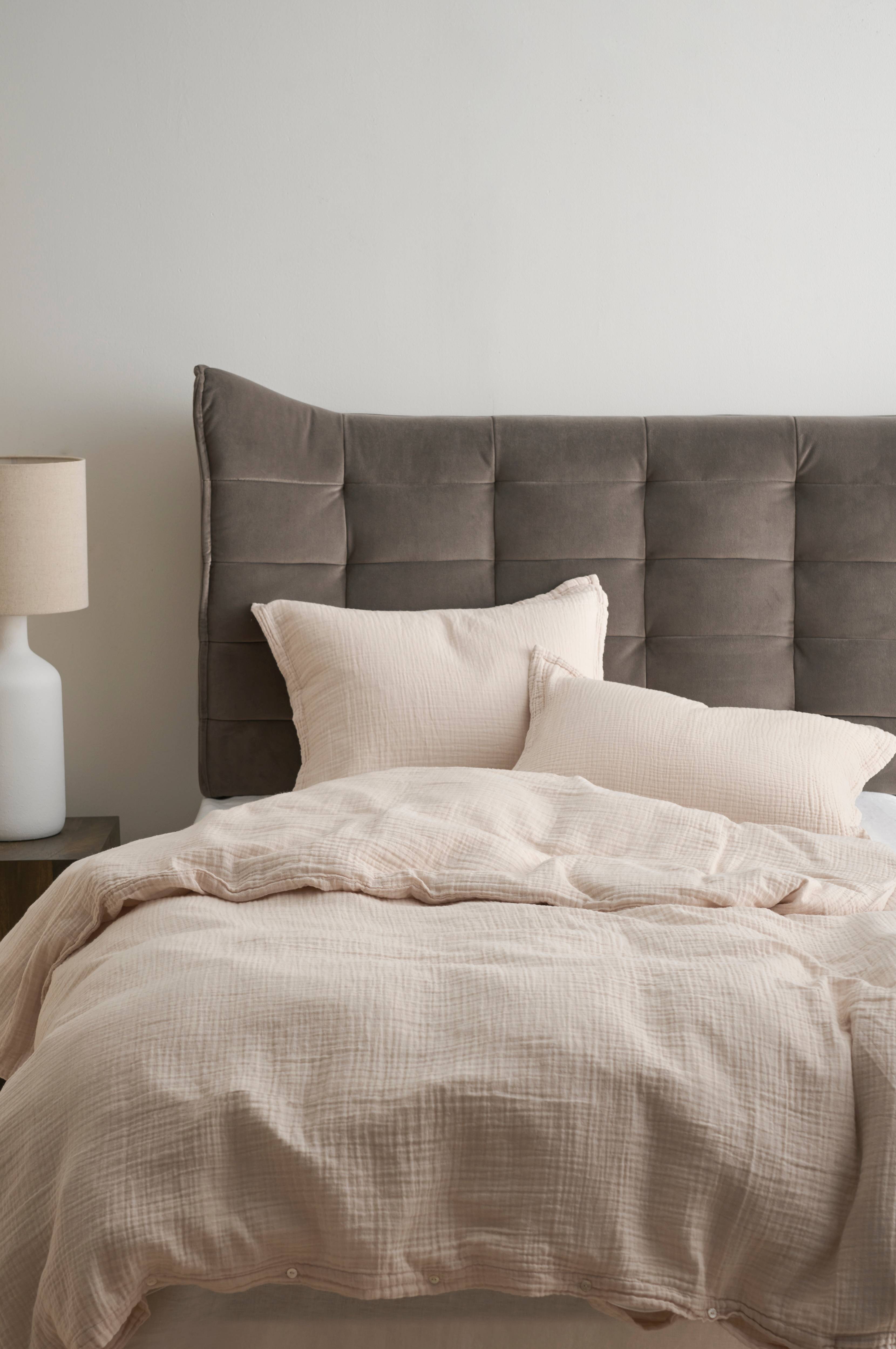 Sengegavl i stoppet fløyel med snurper som danner et dekorativ rutemønster. Skumfyll. Gavlen henges på veggen. Leveres montert. • Produktet inneholder FSC-sertifisert tre som er felt gjennom et ansvarlig skogbruk som tar hensyn til både mennesker og miljø.