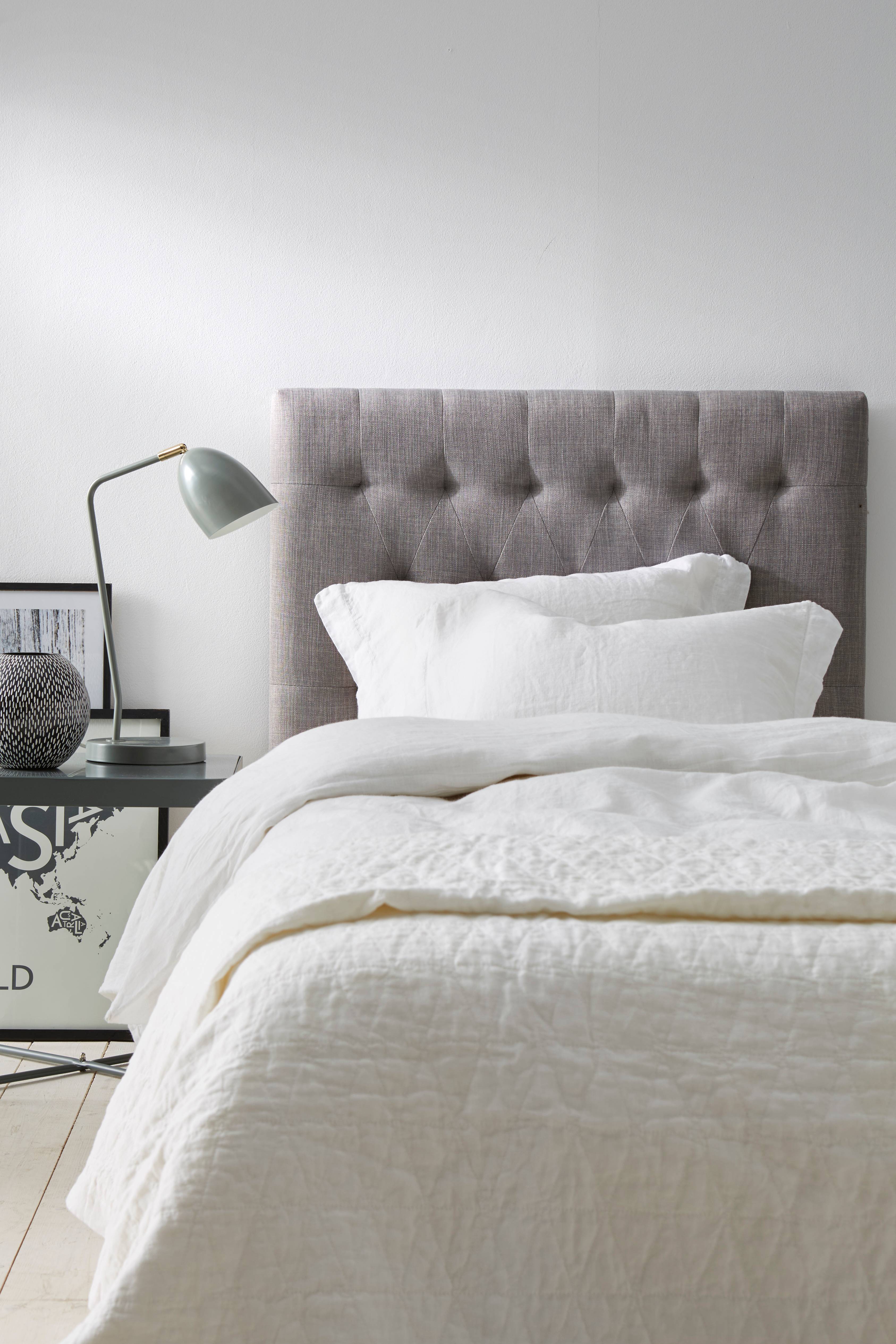 Stoppet sengegavl i bomullskanvas. Henges direkte på veggen. Ramme av MDF, fyll av polyeter. Høyde 61 cm. Bredde 95 cm. Dybde 8 cm. Vekt 13 kg.
