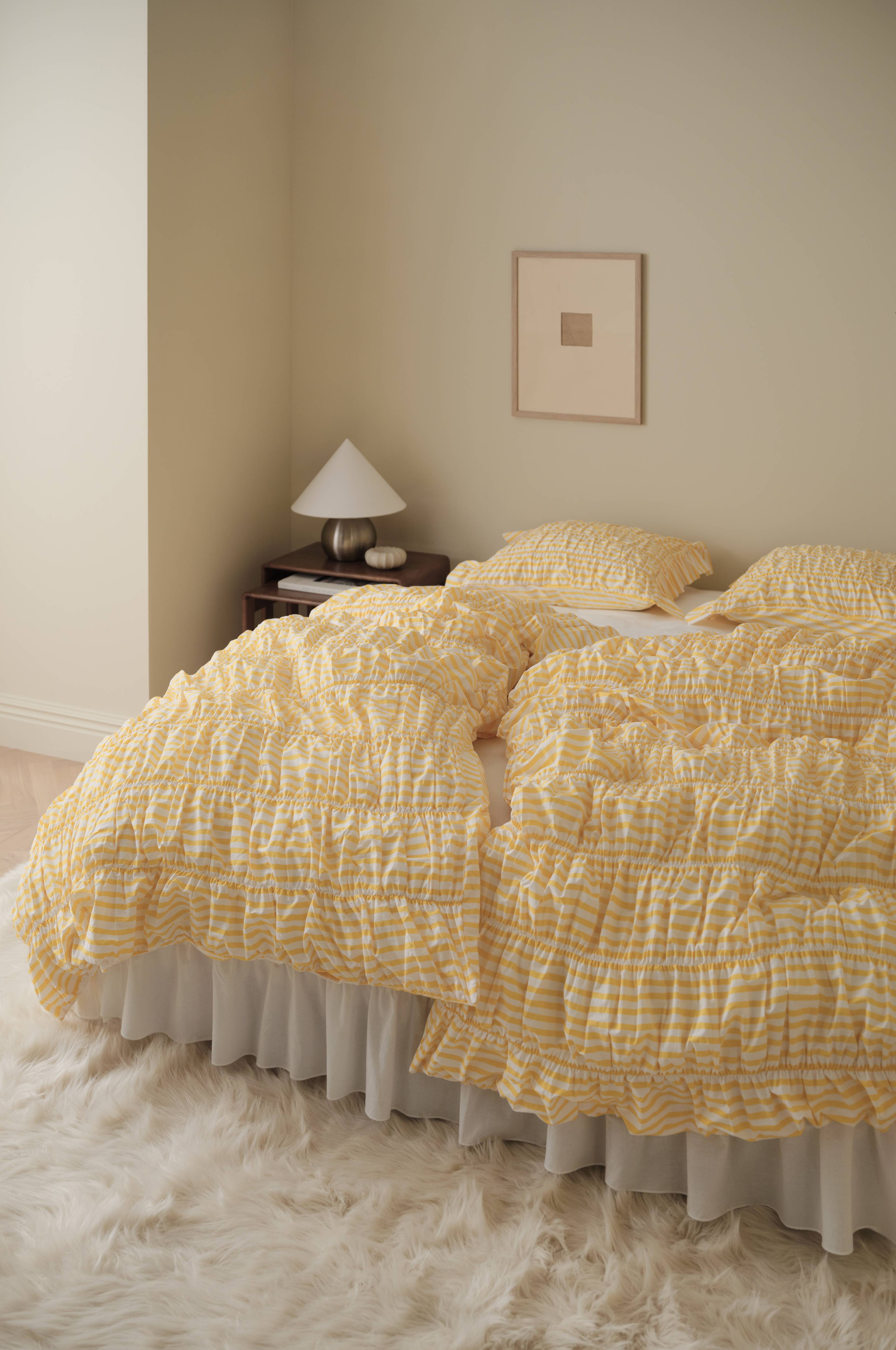 Rynkingen trekker også dynen sammen inne i lakenet.
