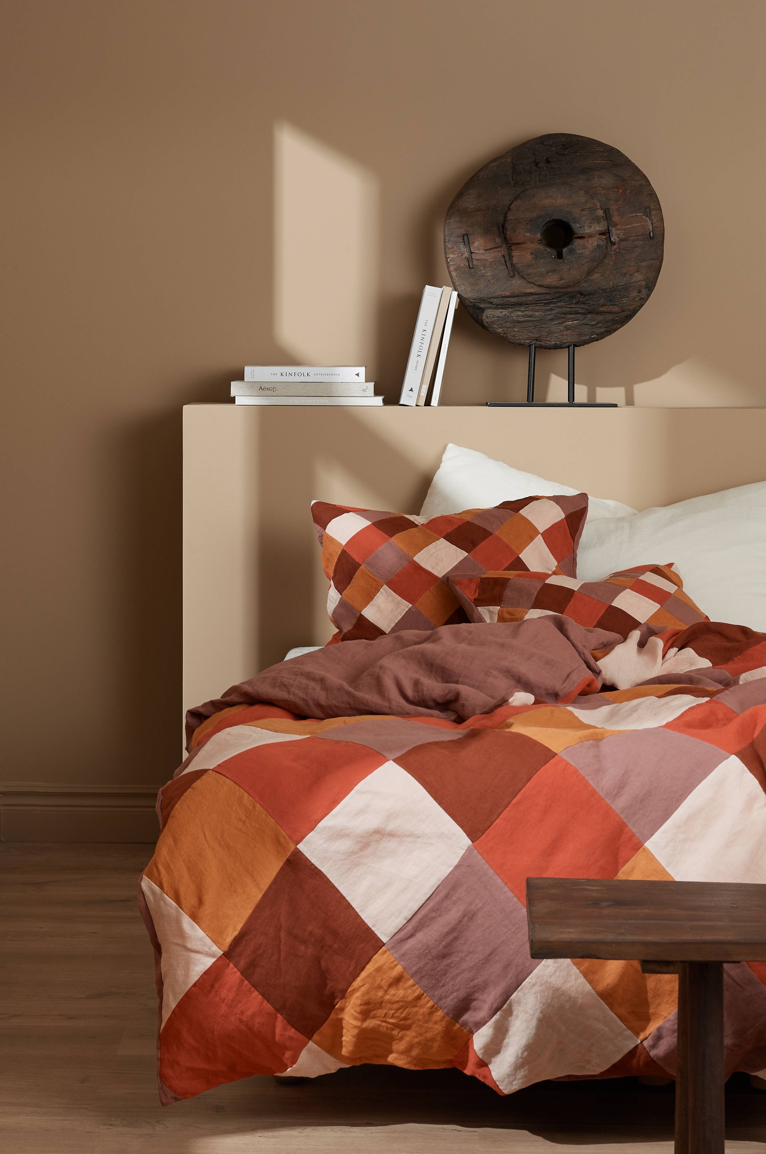 Sengesett i vasket lin. Patchwork på forsiden med håndklipte ruter som er sydd for hånd. Ensfarget bakside.