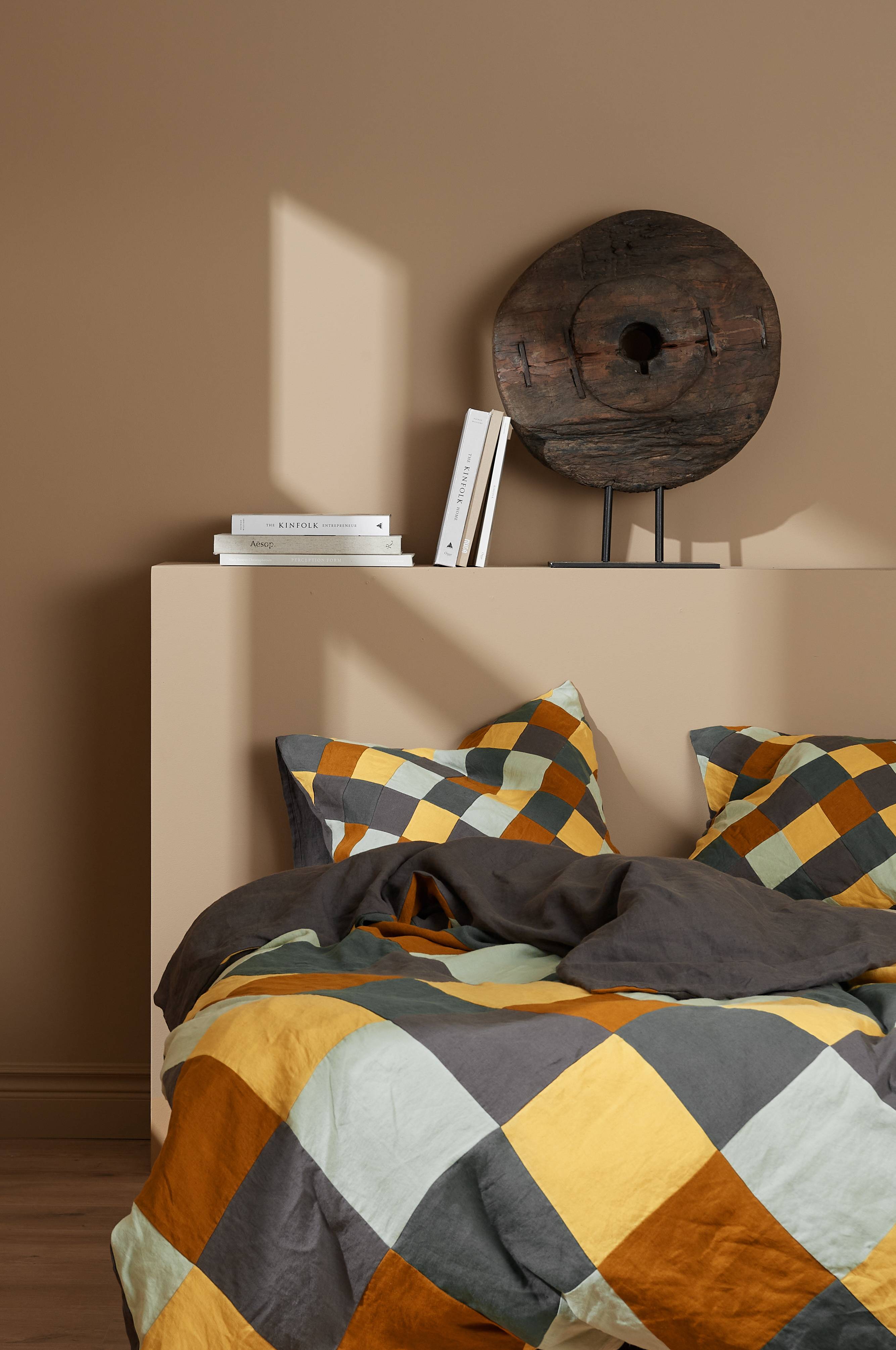 Sengesett i vasket lin. Patchwork på forsiden med håndklipte ruter som er sydd for hånd. Ensfarget bakside.