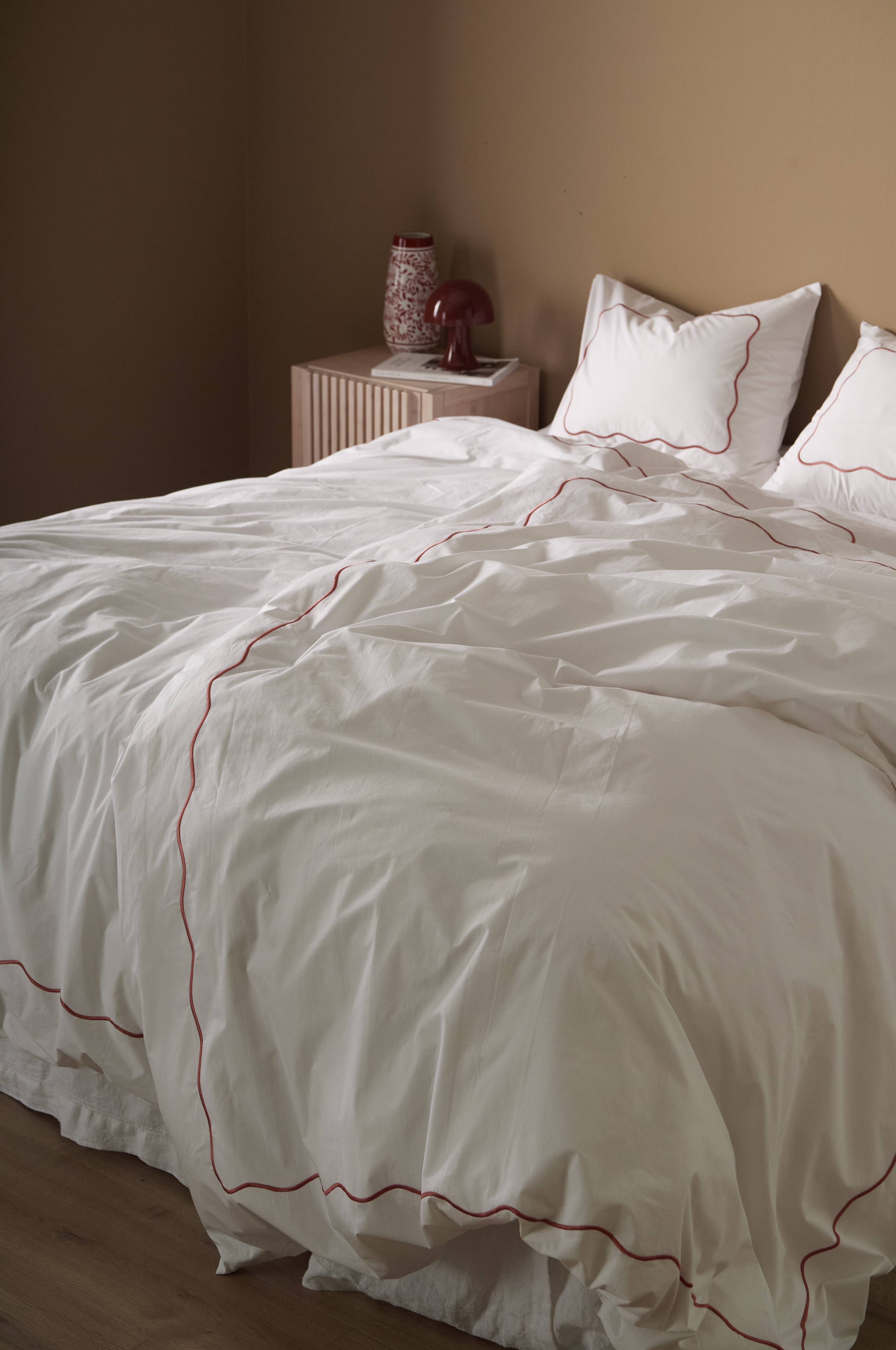 • Tett bølgebroderi rundt hele forsiden av dynetrekket og putevaret