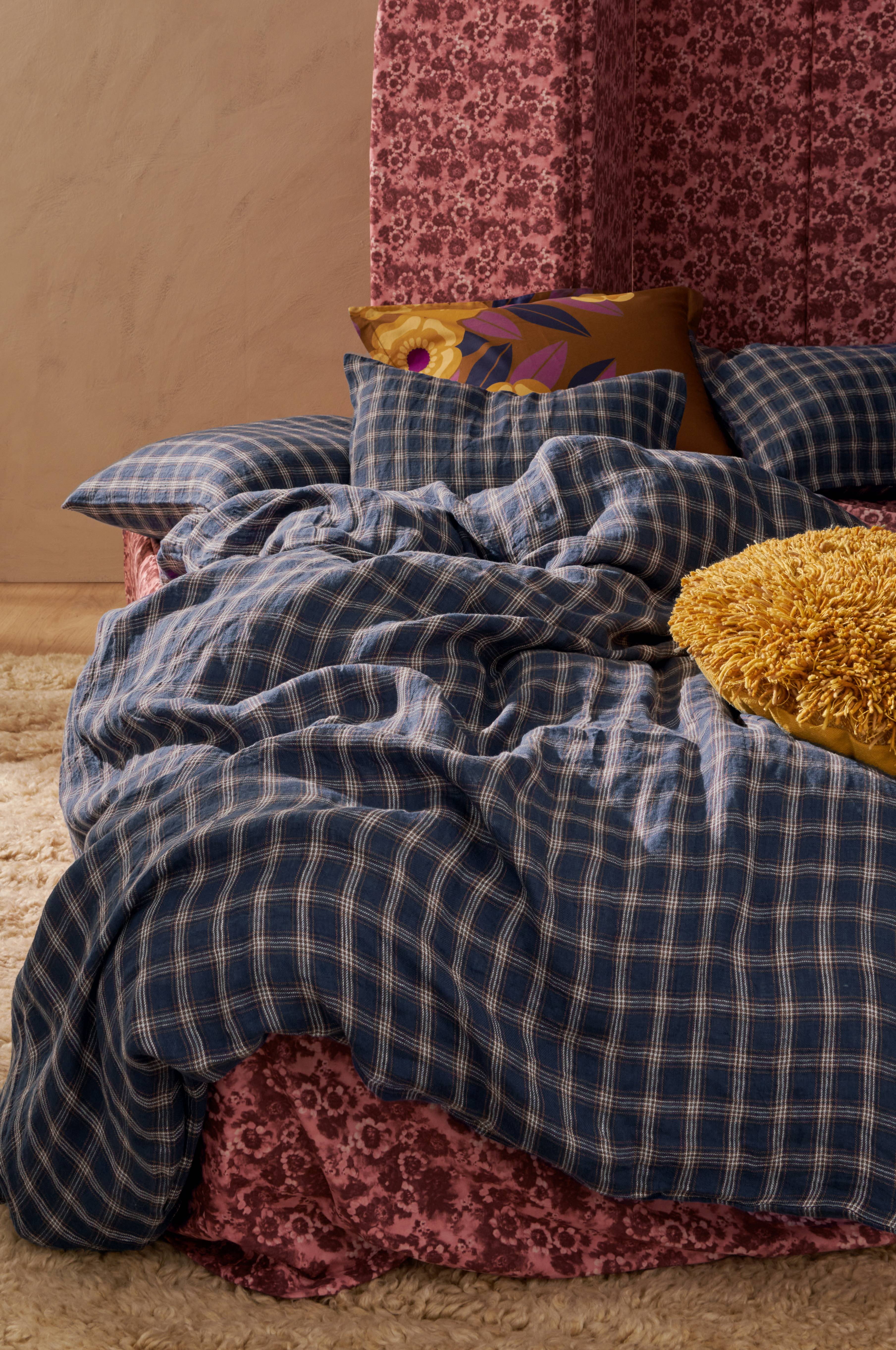 Sengesett i vasket linkvalitet, av fransk lin. Garnfargede ruter. Dynetrekket har trykknapper i nederkanten. Ingen håndhull. Settet leveres i en stoffveske med samme kvalitet og mønster. Størrelse dynetrekk 150x210 cm og putevar 50x60 cm.