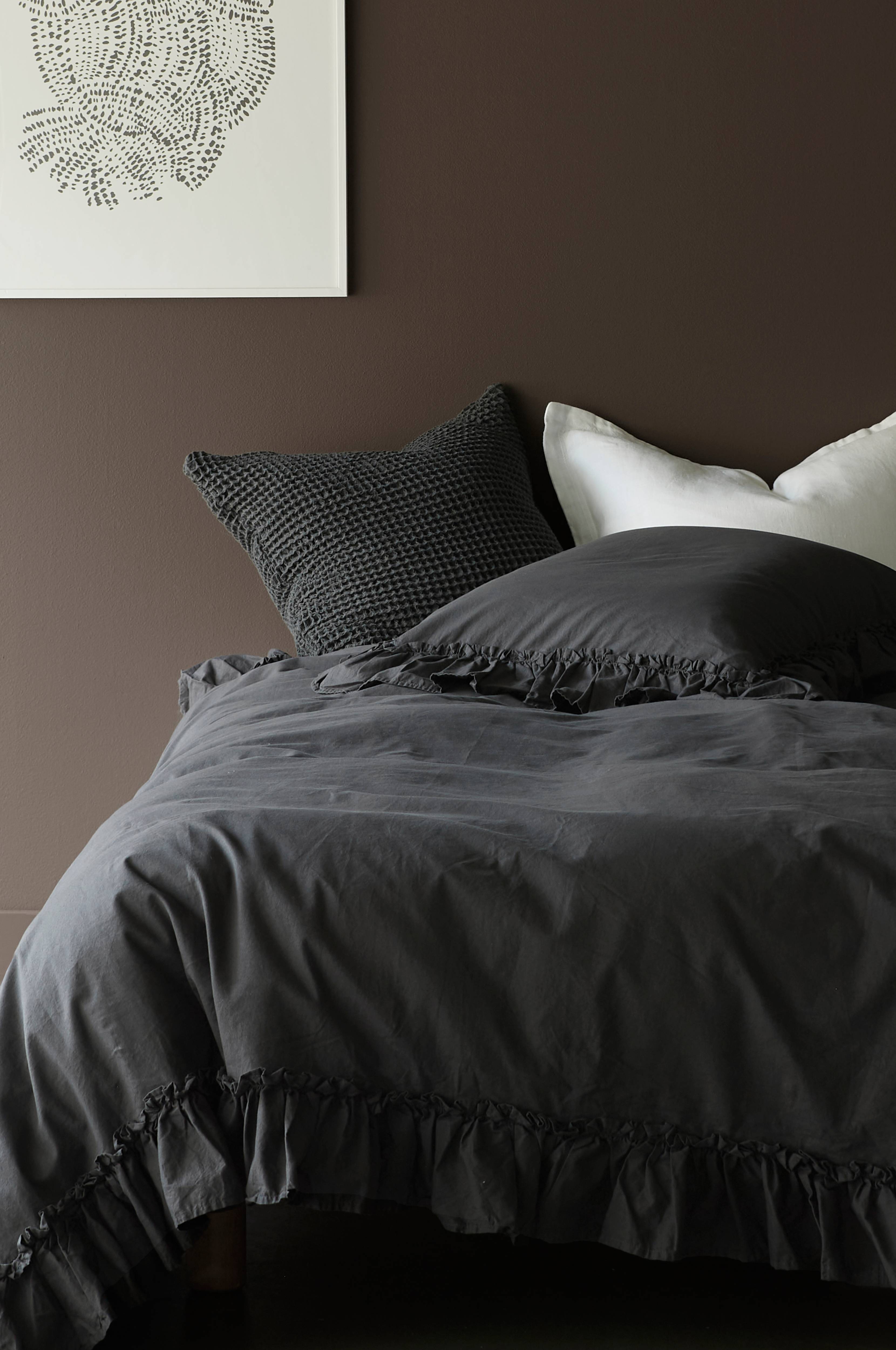 Sengesett i deilig kvalitet av mykvasket, økologisk bomull. Trådtetthet 144 tc. Dynetrekk og putevar med 13 cm rynket volang rundt. Dynetrekket har trykknapper i nederkanten. Ingen håndhull.