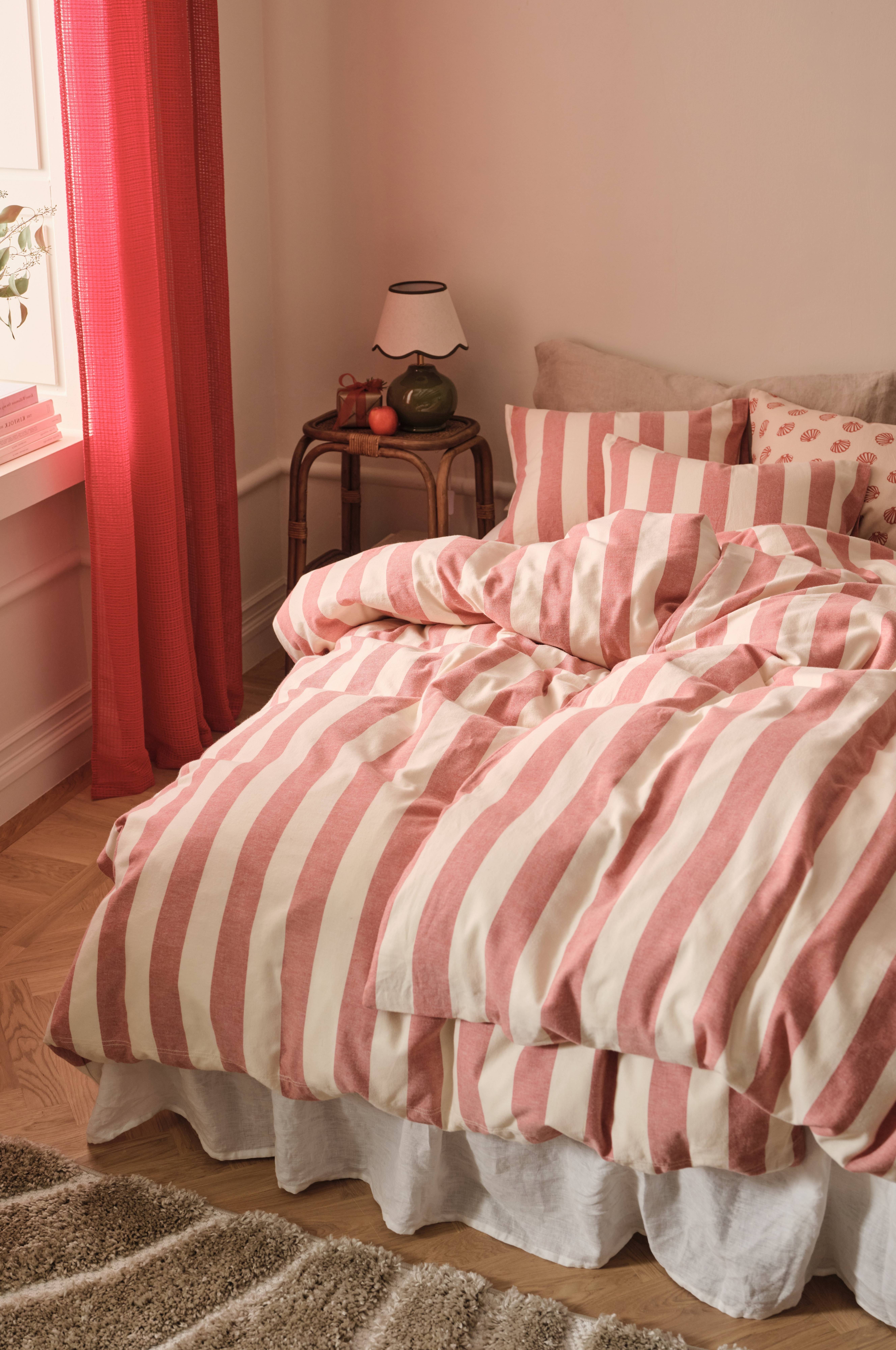 Dynetrekk i flanell av økologisk bomull med garnfargede striper. Vasket kvalitet med myk, børstet overflate og doble jeanssømmer. Trådtetthet 110 TC. Dynetrekket har trykknapper i nederkanten. Ingen håndhull.