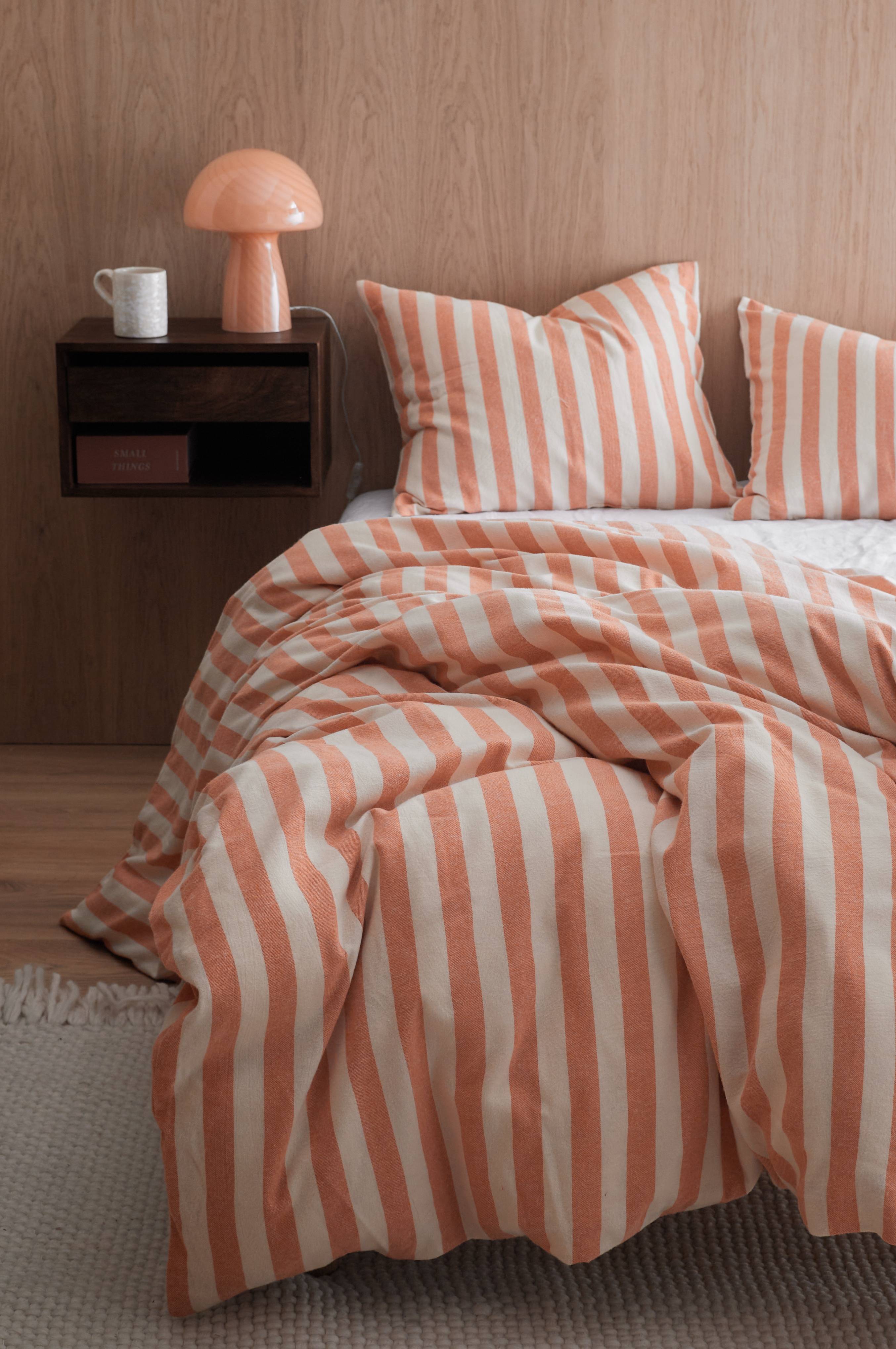 Dynetrekk i flanell av økologisk bomull med garnfargede striper. Vasket kvalitet med myk, børstet overflate og doble jeanssømmer. Trådtetthet 110 TC. Dynetrekket har trykknapper i nederkanten. Ingen håndhull.