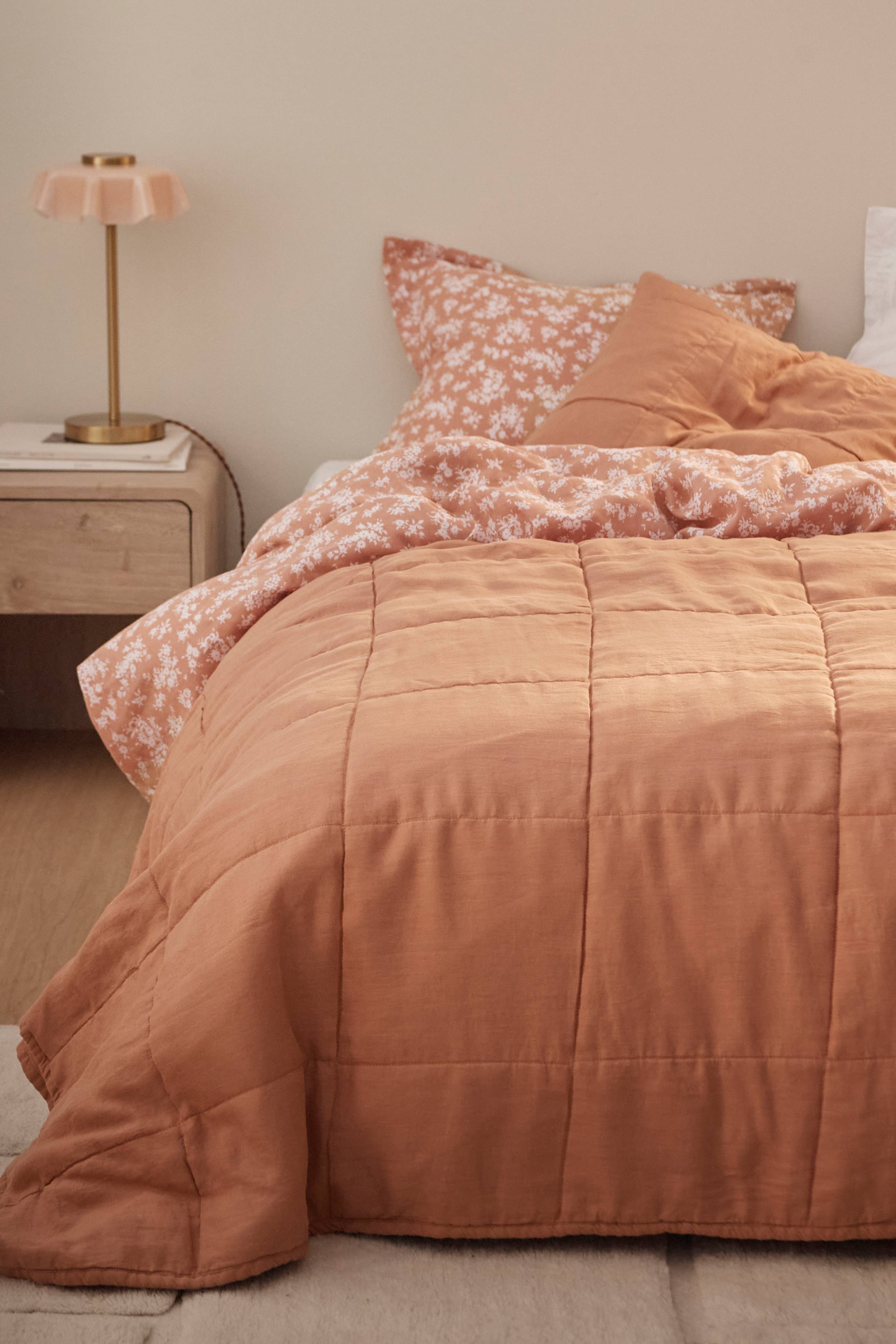 Lett, rutequiltet sengeteppe med forside i vasket lin. Bakside av bomull.