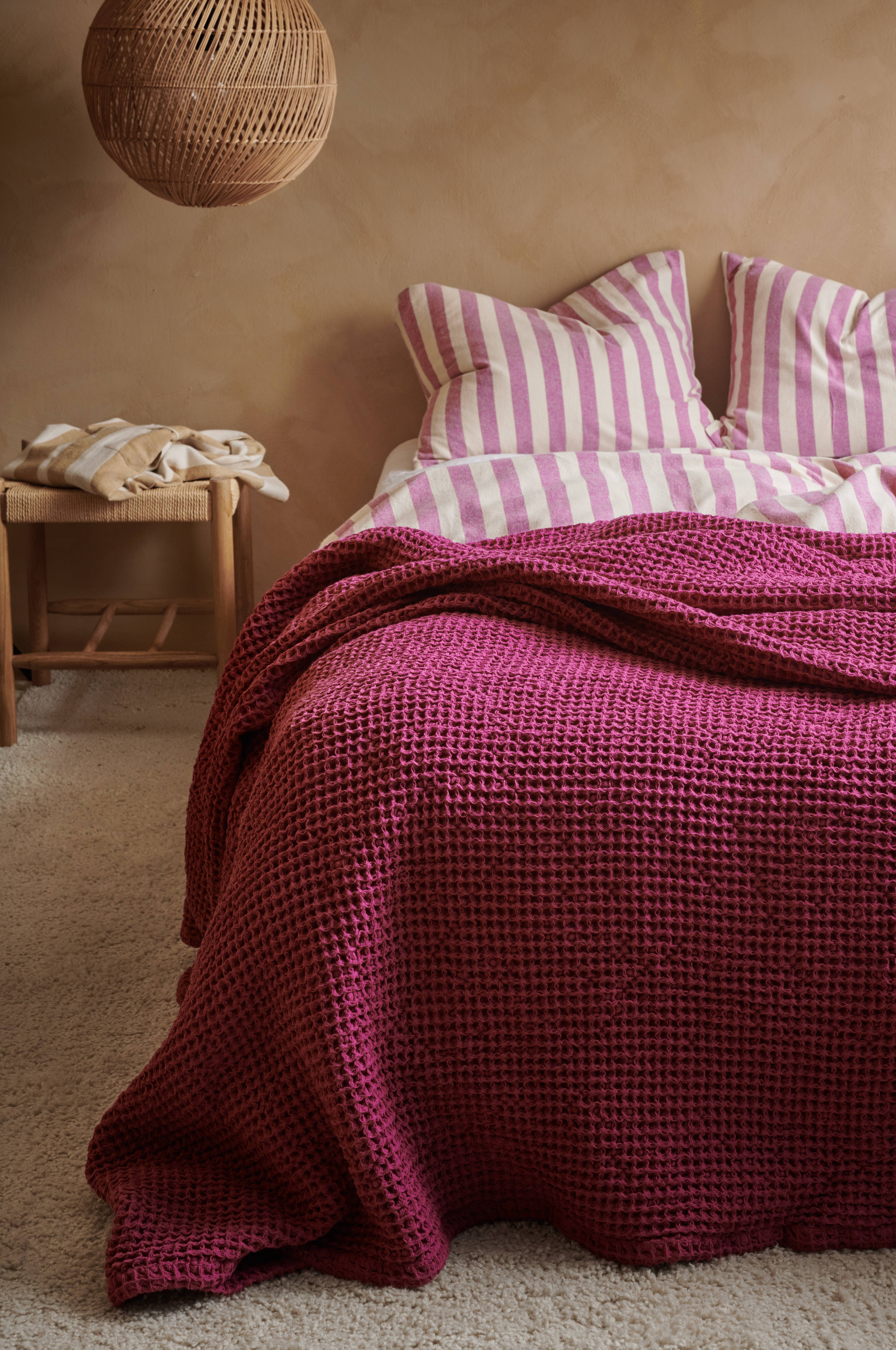 Sengeteppe i vasket bomull med kraftig vaffelmønster.