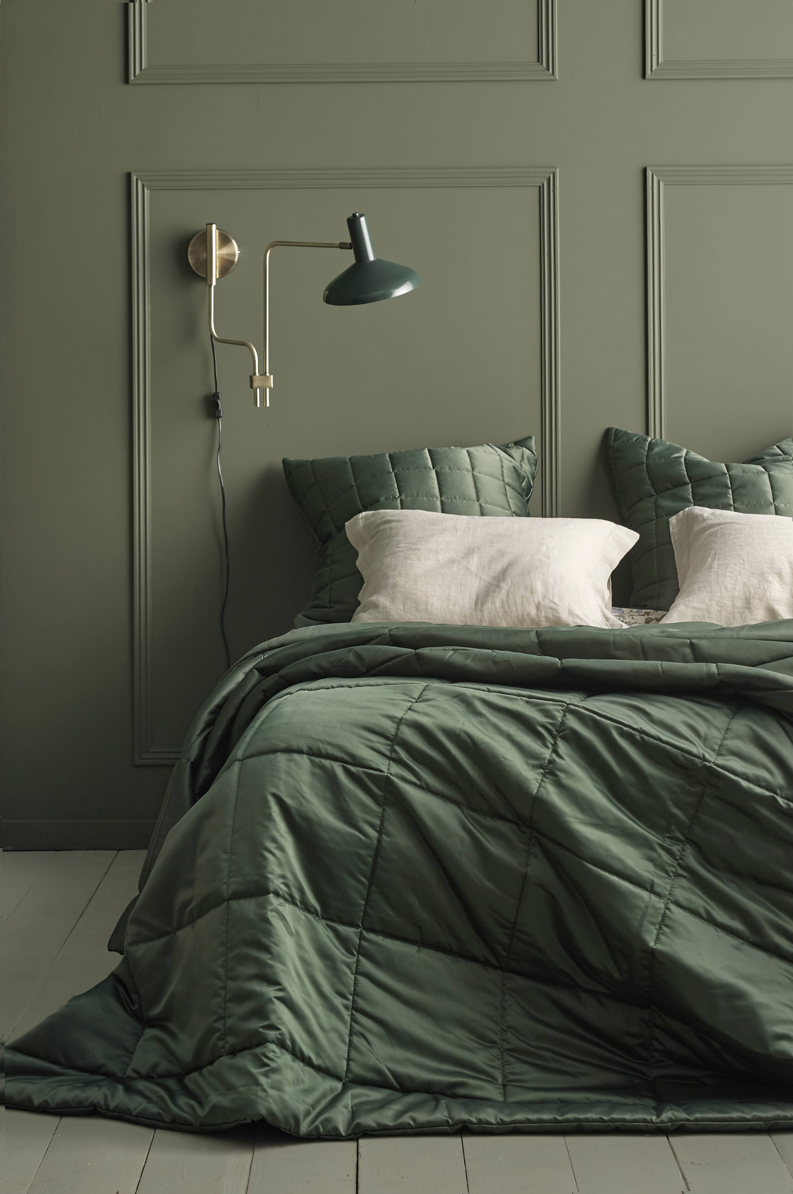 Rutequiltet sengeteppe med bord rundt. Blank overflate som gir en luksuriøs følelse.