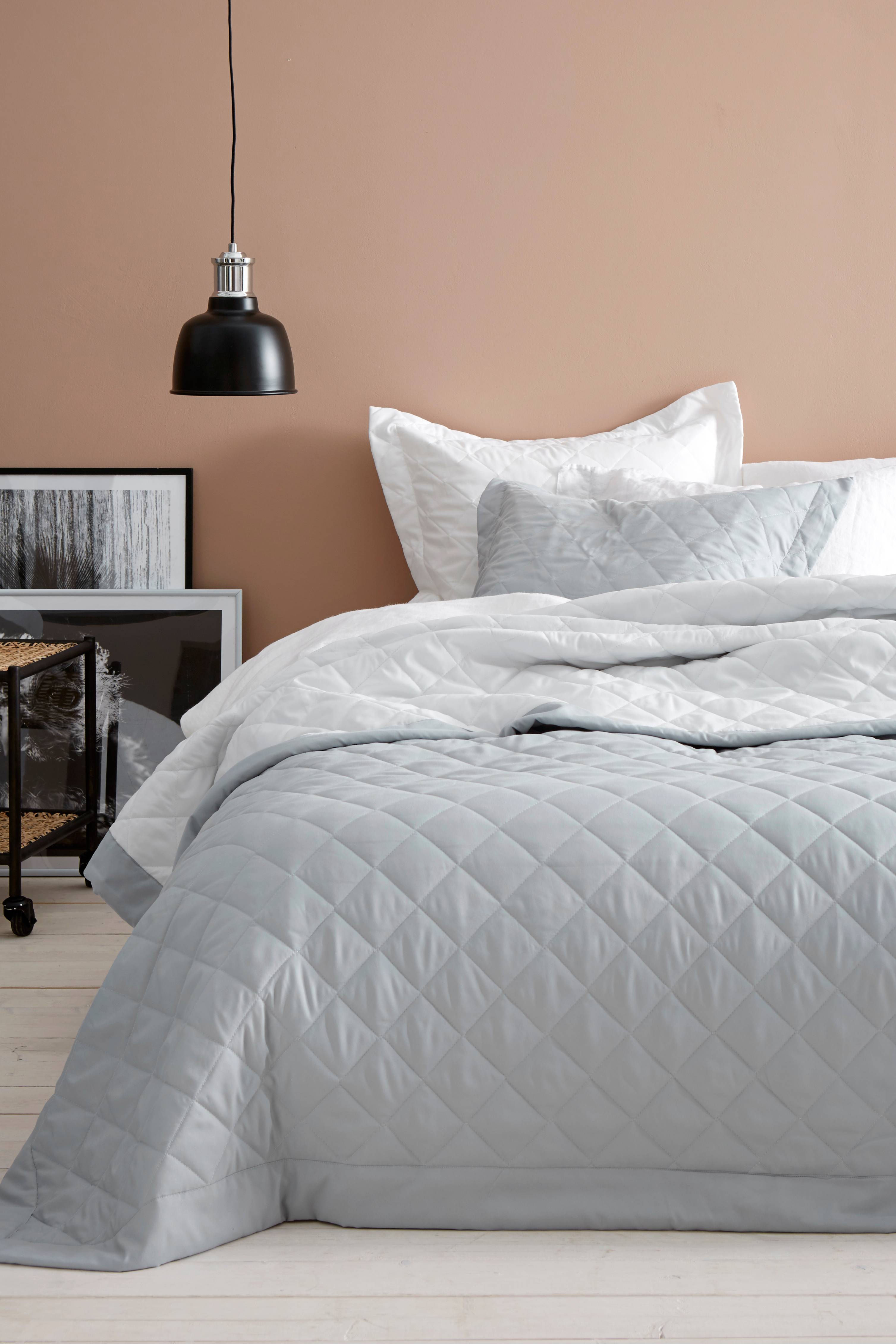 Diagonalquiltet sengeteppe med ramme rundt. Dobbeltsidig/vendbart, ulikfarget for- og baksider med farger som går ton-i-ton. Ytterstoff og fyll av polyester.