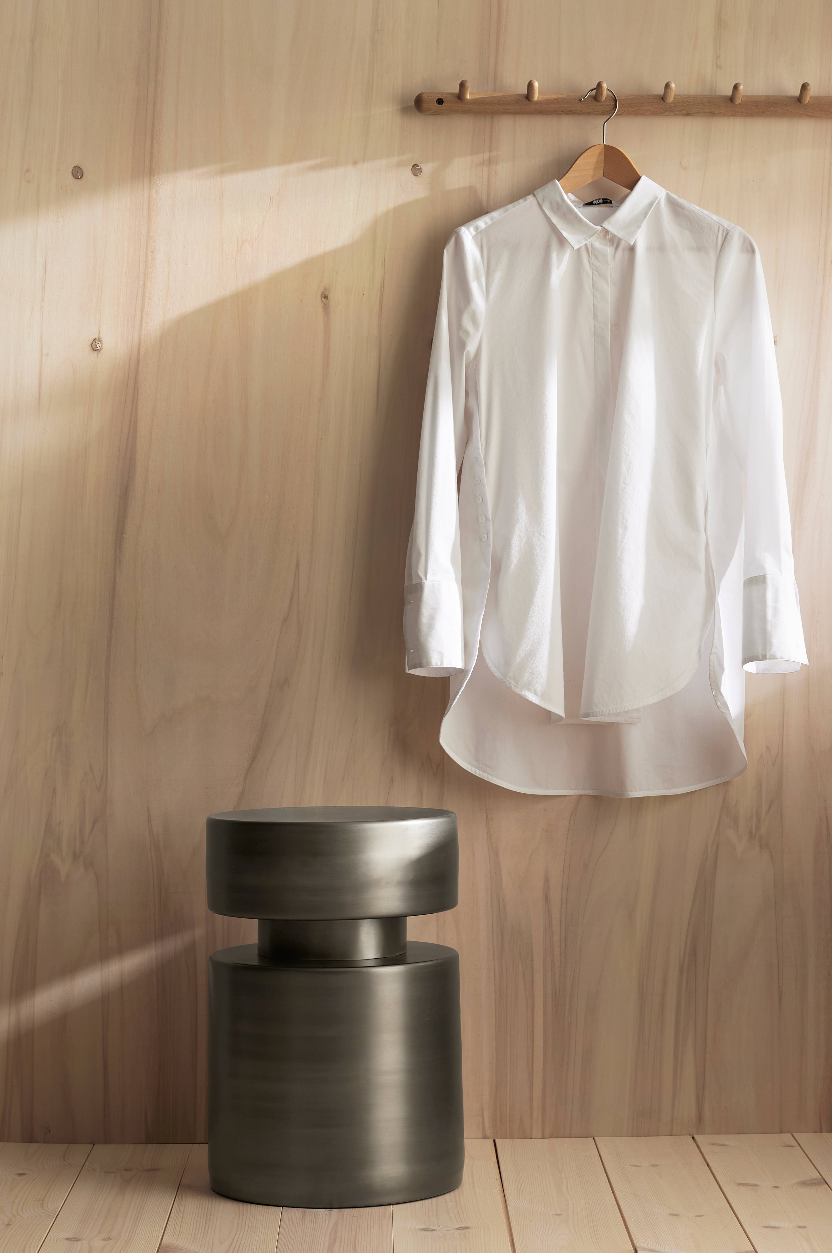 Formstøpt sidebord eller krakk av metall med antikkfinish. Høyde 48 cm, diameter 32 cm. Maks. vektbelastning 100 kg. Knotter på undersiden.