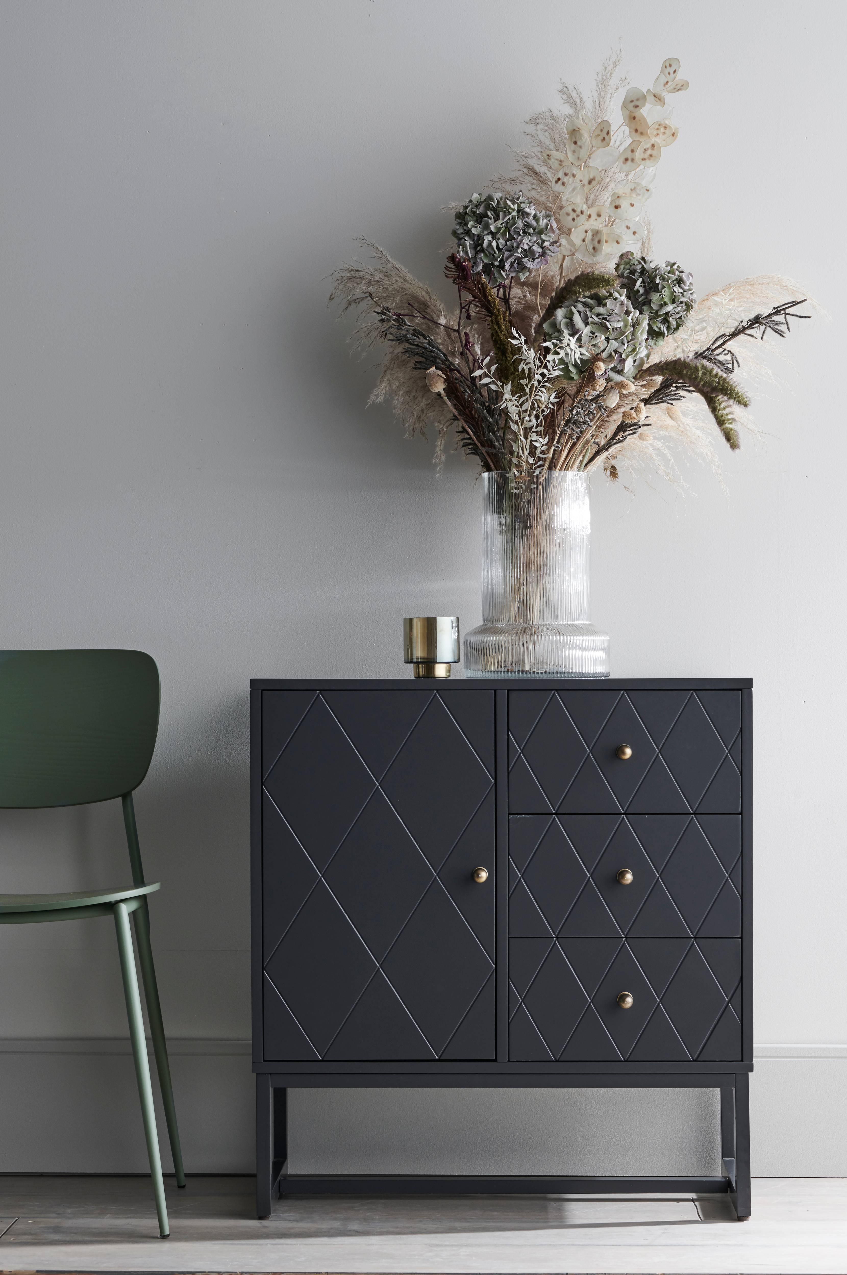 Dekorativt skap av MDF med frest mønster. Ben av tre. 3 skuffer med stoppere og et skap med ett fast hylleplan. Beslag i antikkmessingfarget metall. Mål: 70x35 cm. Høyde 76 cm. Høyde fra gulvet til skapets nederkant ca. 18,5 cm. Leveres umontert.
