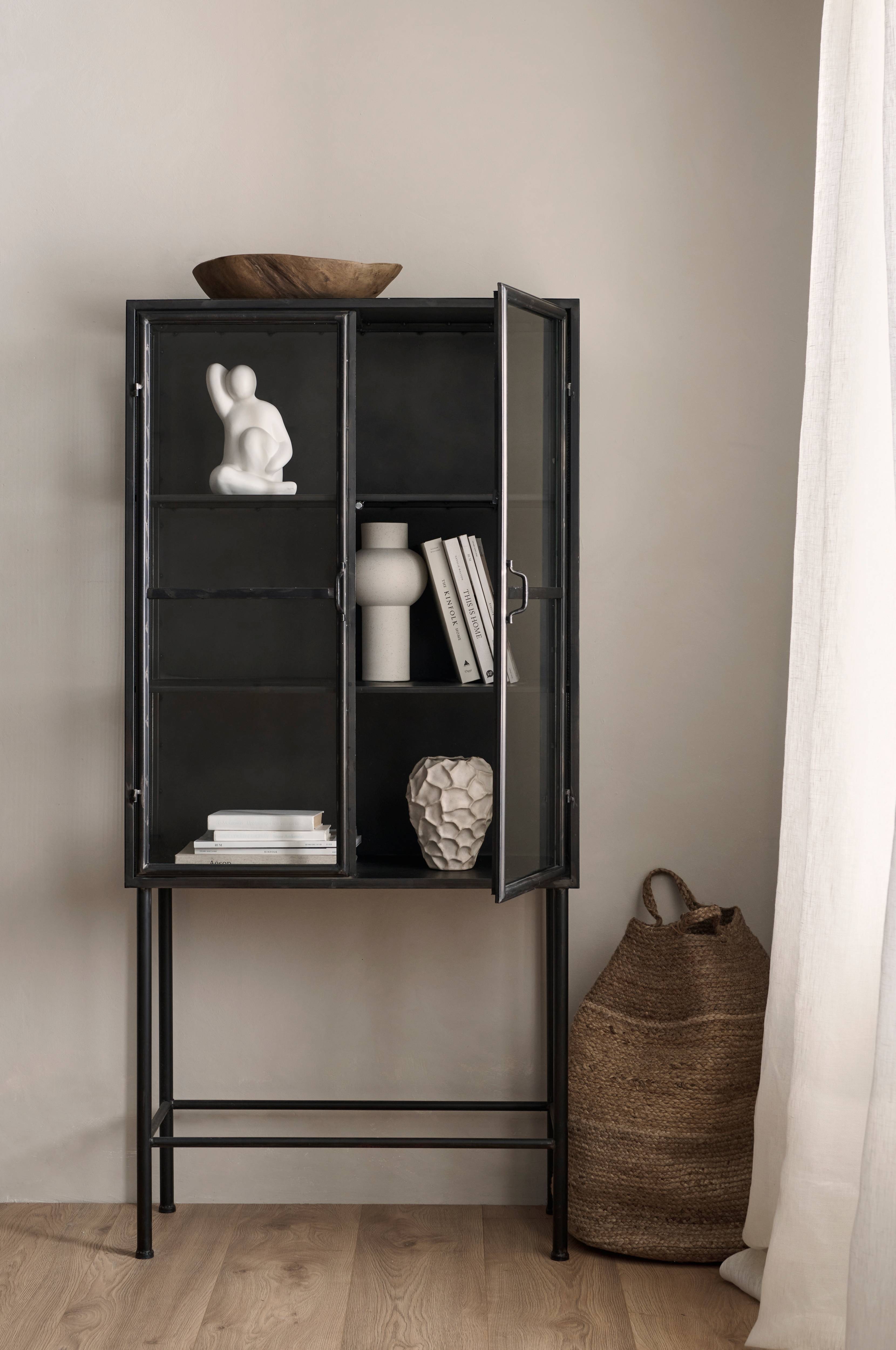 Skap av metall i pen industriell look med raster på sidene. Dører med glass, metallhåndtak og magnetlås. To faste hylleplan. Maks vekt på hvert hylleplan er 15 kg. Høyde 180 cm, bredde 85 cm, dybde 40 cm. Høyde opp til skapet 69 cm. Høyde mellom hylleplanene 34 cm. Skapet bør forankres i veggen, forhåndsborede hull på baksiden. Beslag/skruer medfølger ikke. Leveres montert.