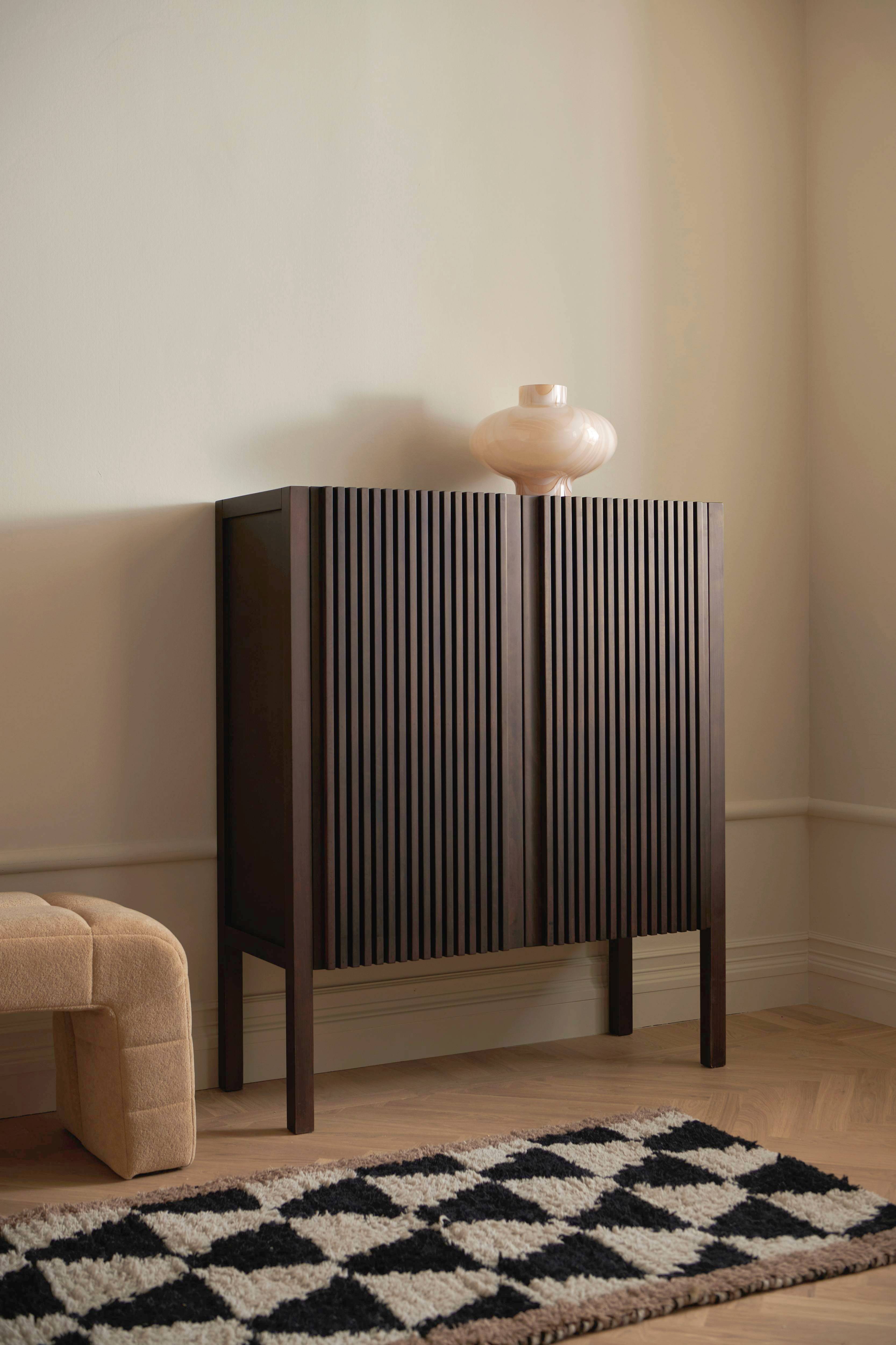 Skap i bøk med ribbet tekstur på dørene. 2 faste hyller i skapet, høyde mellom hyller ca. 27 cm. Frihøyde under møbelet 30 cm.